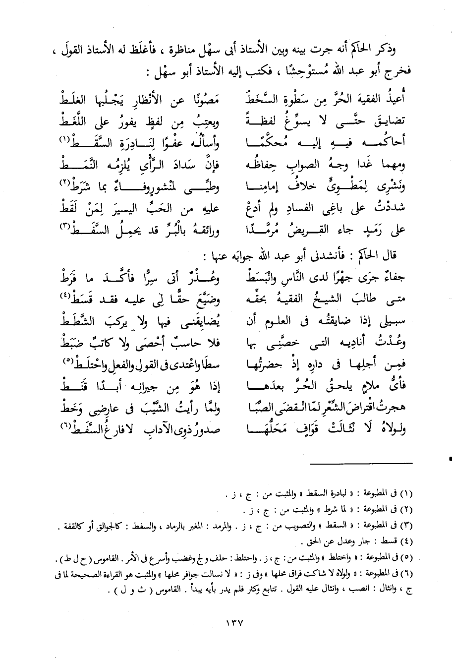 وَذكر الْحَاكِم أَنه جرت بَينه وَبَين الْأُسْتَاذ أَبى سهل مناظرة فَأَغْلَظ لَهُ الْأُسْتَاذ القَوْل فَخرج أَبُو عبد الله مستوحشا فَكتب إِلَيْهِ الْأُسْتَاذ أَبُو سهل