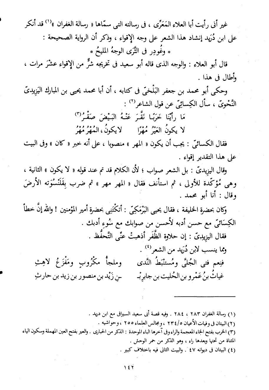 غير أَنى رَأَيْت أَبَا الْعَلَاء المعرى فى رسَالَته الَّتِى سَمَّاهَا رِسَالَة الغفران قد أنكر على ابْن دُرَيْد إنشاد هَذَا الشّعْر على وَجه الإقواء وَذكر أَن الرِّوَايَة الصَّحِيحَة