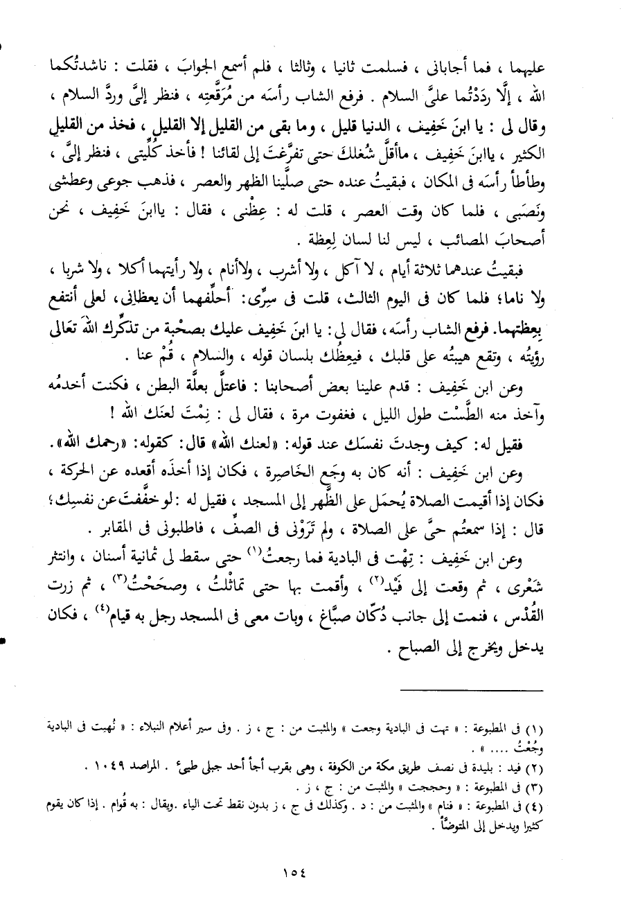 عَلَيْهِمَا فَمَا أجابانى فَسلمت ثَانِيًا وثالثا فَلم أسمع الْجَواب فَقلت ناشدتكما الله إِلَّا رددتما على السَّلَام فَرفع الشَّاب رَأسه من مرقعته فَنظر إِلَى ورد السَّلَام وَقَالَ لى يَا ابْن خَفِيف الدُّنْيَا قَلِيل وَمَا بقى من الْقَلِيل إِلَّا الْقَلِيل فَخذ من الْقَلِيل الْكثير يَا ابْن خَفِيف مَا أقل شغلك حَتَّى تفرغت إِلَى لقائنا فَأخذ كليتى فَنظر إِلَى وطأطأ رَأسه فى الْمَكَان فَبَقيت عِنْده حَتَّى صلينَا الظّهْر وَالْعصر فَذهب جوعى وعطشى ونصبى فَلَمَّا كَانَ وَقت الْعَصْر قلت لَهُ عظنى فَقَالَ يَا ابْن خَفِيف نَحن أَصْحَاب المصائب لَيْسَ لنا لِسَان لعظة