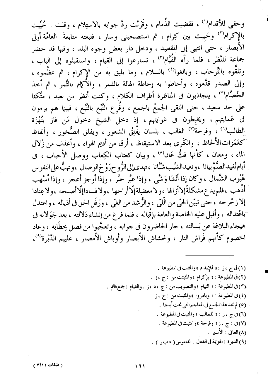 وحفى للأقدام فَقضيت الذمام وقرنت رد جَوَابه بالاستلام وَقلت حييت بالإكرام وحييت بَين كرام ثمَّ استصحبنى وَسَار فتبعته مُتَابعَة الْعَامَّة أولى الْأَبْصَار حَتَّى انْتهى إِلَى الْمَقْصد وَدخل دَار بعض وُجُوه الْبَلَد وفيهَا قد حضر جمَاعَة للنَّظَر فَلَمَّا رَآهُ الْقيام تسارعوا إِلَى الْقيام واستقبلوه إِلَى الْبَاب وتلقوه بالترحاب وبالغوا بِالسَّلَامِ وَمَا يَلِيق بِهِ من الْإِكْرَام ثمَّ عظموه وَإِلَى الصَّدْر قدموه وَأَحَاطُوا بِهِ إحاطة الهالة بالقمر والأكمام بالثمر ثمَّ أَخذ الْخِصَام يتجاذبون فى المناظرة أَطْرَاف الْكَلَام وَكنت أنظر من بعيد مُتكئا على حد سعيد حَتَّى التقى الْجمع بِالْجمعِ وقرع النبع بالنبع فَبَيْنَمَا هم يرْمونَ فى عمايتهم ويخبطون فى غوايتهم إِذْ دخل الشَّيْخ دُخُول من فَازَ بنهزة الطَّالِب وفرحة الْغَالِب بِلِسَان يفتق الشُّعُور ويفلق الصخور وألفاظ كغمزات الألحاظ والكرى بعد الاستيقاظ أرق من أَدِيم الْهَوَاء وأعذب من زلال المَاء وَمَعَان كَأَنَّهَا فك عان وَبَيَان كعتاب الكعاب وَوصل الأحباب فى أَيَّام تفِيد الصم بَيَانا وتعيد الشيب شبانا تهدى إِلَى الرّوح روح الْوِصَال وتهب على النُّفُوس هبوب الشمَال وَكَانَ إِذا أنشا وشى وَإِذا عبر حبر وَإِذا أوجز أعجز وَإِذا أسهب أذهب فَلم يدع مشكلة إِلَّا أزالها وَلَا معضلة إِلَّا أزاحها وَلَا فَسَادًا إِلَّا أصلحه وَلَا عنادا إِلَّا زحزحه حَتَّى تبين الحى من اللى والرشد من الغى ورفل الْحق فى أذياله واعتدل باعتداله وَأَقْبل عَلَيْهِ الْخَاصَّة والعامة بإقباله فَلَمَّا فرغ من إنْشَاء دلَالَته بعد جولانه فى هيجاء البلاغة عَن بسالته حَار الْحَاضِرُونَ فى جَوَابه وتعجبوا من فصل خطابه وَعَاد الْخُصُوم كَأَنَّهُمْ فرَاش النَّار وخشاش الْأَبْصَار وأوباش الْأَمْصَار عَلَيْهِم الدبرة
