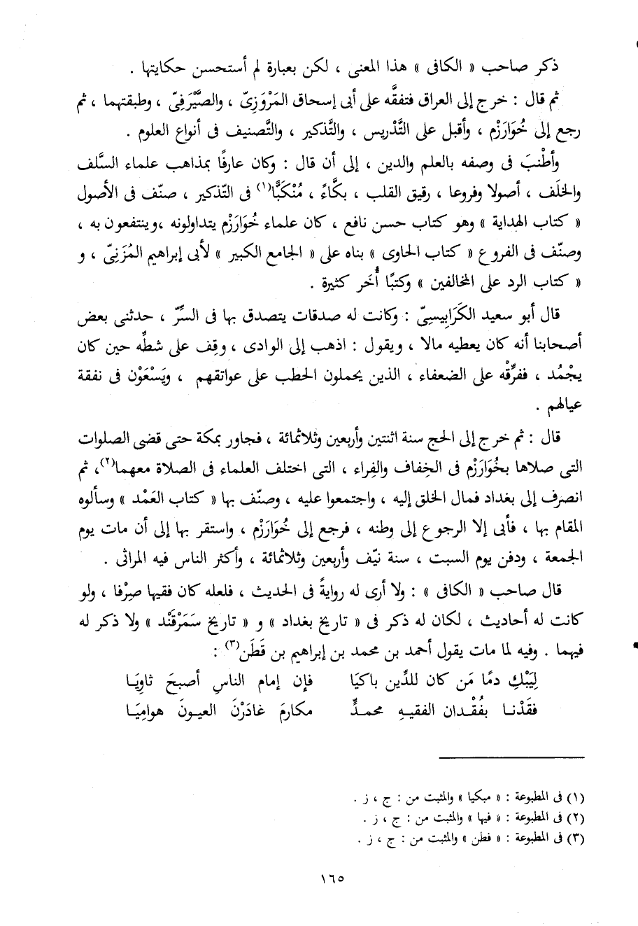 قَالَ ثمَّ خرج إِلَى الْحَج سنة اثْنَتَيْنِ وَأَرْبَعين وثلاثمائة فجاور بِمَكَّة حَتَّى قضى الصَّلَوَات الَّتِى صلاهَا بخوارزم فى الْخفاف وَالْفراء الَّتِى اخْتلف الْعلمَاء فى الصَّلَاة مَعَهُمَا ثمَّ انْصَرف إِلَى بَغْدَاد فَمَال الْخلق إِلَيْهِ واجتمعوا عَلَيْهِ وصنف بهَا كتاب الْعمد وسألوه الْمقَام بهَا فَأبى إِلَّا الرُّجُوع إِلَى وَطنه فَرجع إِلَى خوارزم وَاسْتقر بهَا إِلَى أَن مَاتَ يَوْم الْجُمُعَة وَدفن يَوْم السبت سنة نَيف وَأَرْبَعين وثلاثمائة وَأكْثر النَّاس فِيهِ المراثى