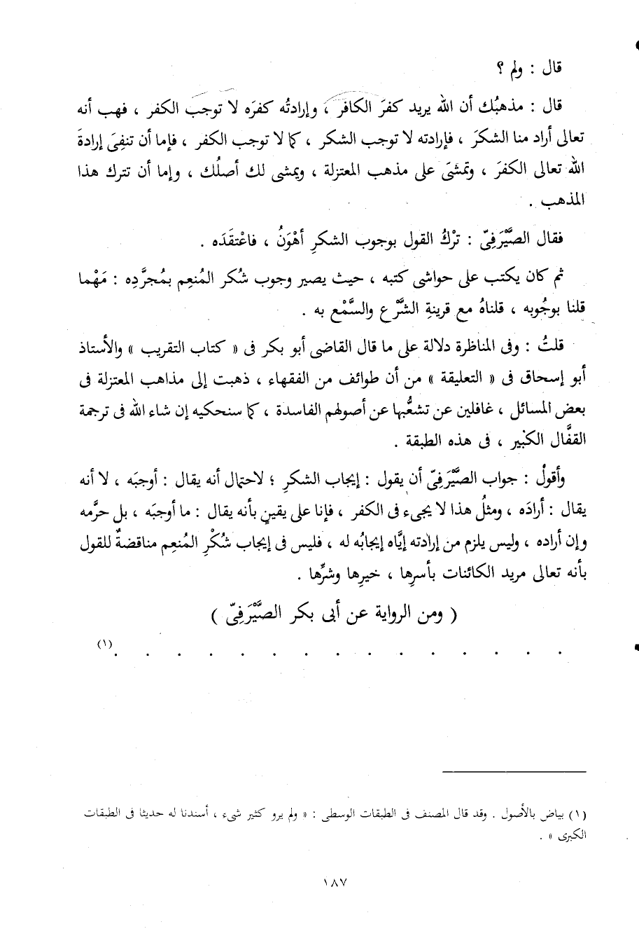 وَأَقُول جَوَاب الصيرفى أَن يَقُول إِيجَاب الشُّكْر لاحْتِمَال أَنه يُقَال أوجبه لَا أَنه يُقَال أَرَادَهُ وَمثل هَذَا لَا يجِئ فى الْكفْر فَإنَّا على يَقِين بِأَنَّهُ يُقَال مَا أوجبه بل حرمه وَإِن أَرَادَهُ وَلَيْسَ يلْزم من إِرَادَته إِيَّاه إِيجَابه لَهُ فَلَيْسَ فى إِيجَاب شكر الْمُنعم مناقضة لِلْقَوْلِ بِأَنَّهُ تَعَالَى مُرِيد الكائنات بأسرها خَيرهَا وشرها