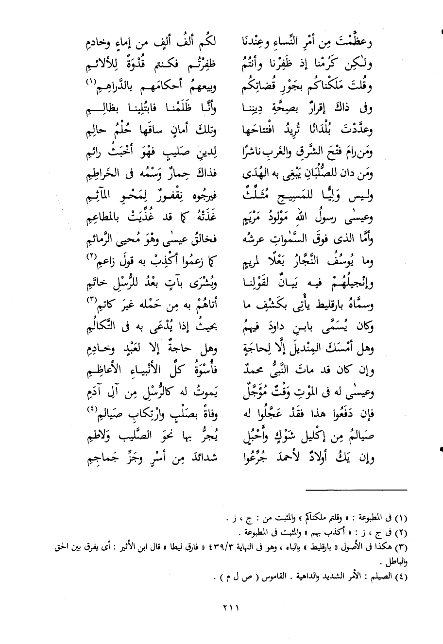 (وَمن دَان للصلبان يبغى بِهِ الْهدى ... فَذَاك حمَار وسمه فى الخراطم)