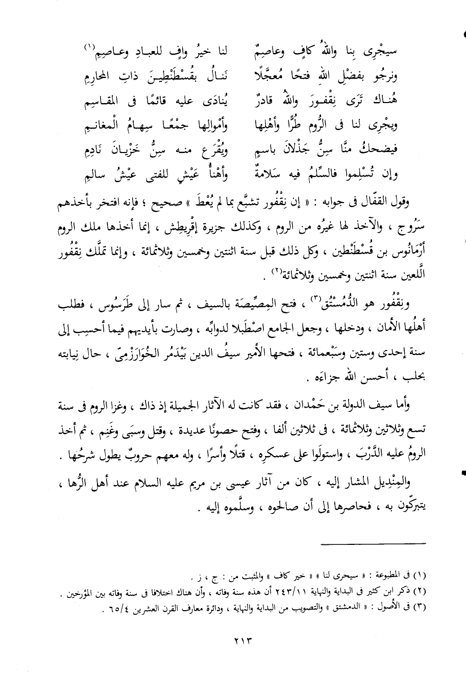 وَأما سيف الدولة بن حمدَان فقد كَانَت لَهُ الْآثَار الجميلة إِذْ ذَاك وغزا الرّوم فى سنة تسع وَثَلَاثِينَ وثلاثمائة فى ثَلَاثِينَ ألفا وَفتح حصونا عديدة وَقتل وسبى وغنم ثمَّ أَخذ الرّوم عَلَيْهِ الدَّرْب واستولوا على عسكره قتلا وأسرا وَله مَعَهم حروب يطول شرحها