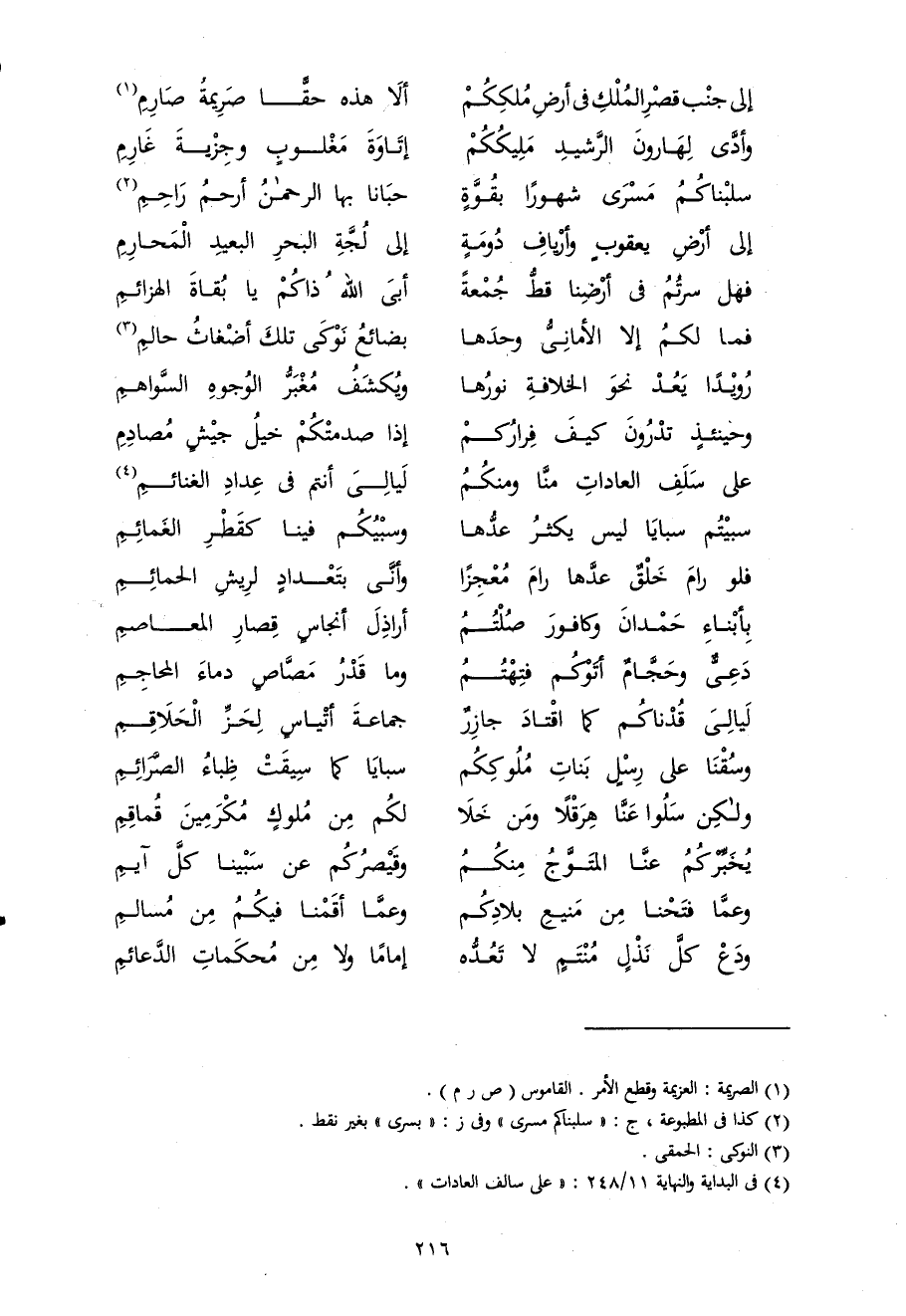 (فَهَل سِرْتُمْ فى أَرْضنَا قطّ جُمُعَة ... أَبى الله ذاكم يَا بقاة الهزائم)