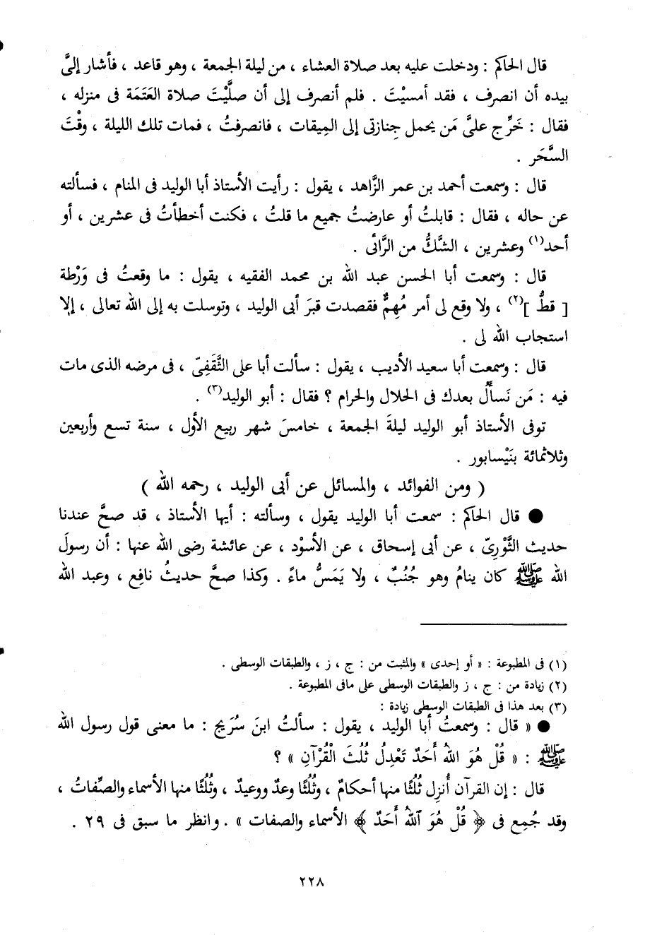 قَالَ وَسمعت أَحْمد بن عمر الزَّاهِد يَقُول رَأَيْت الْأُسْتَاذ أَبَا الْوَلِيد فى الْمَنَام فَسَأَلته عَن حَاله فَقَالَ قابلت أَو عارضت جَمِيع مَا قلت فَكنت أَخْطَأت فى عشْرين أَو أحد وَعشْرين الشَّك من الرائى