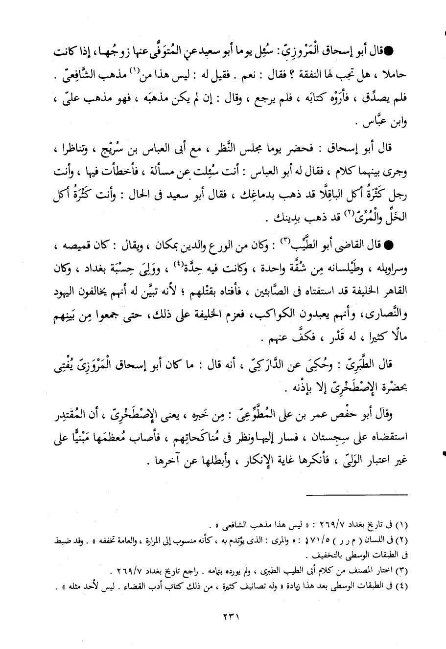 قَالَ الطبرى وَحكى عَن الداركى أَنه قَالَ مَا كَانَ أَبُو إِسْحَاق المروزى يُفْتى بِحَضْرَة الإصطخرى إِلَّا بِإِذْنِهِ