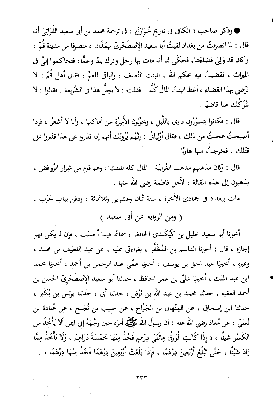 وَذكر صَاحب الكافى فى تَارِيخ خوارزم فى تَرْجَمَة مُحَمَّد بن أَبى سعيد الفراتى أَنه قَالَ لما انصرفت من بَغْدَاد لقِيت أَبَا سعيد الإصطخرى بهمذان منصرفا من مَدِينَة قُم وَكَانَ قد ولى قضاءها فَحكى لنا أَنه مَاتَ بهَا رجل وَترك بِنْتا وَعَما فَتَحَاكَمُوا إِلَى فى الْمِيرَاث فَقضيت فِيهِ بِحكم الله للْبِنْت النّصْف والباقى للعم فَقَالَ أهل قُم لَا نرضى بِهَذَا الْقَضَاء أعْط الْبِنْت المَال كُله فَقلت لَا يحل هَذَا فى الشَّرِيعَة فَقَالُوا لَا نَتْرُكك هُنَا قَاضِيا