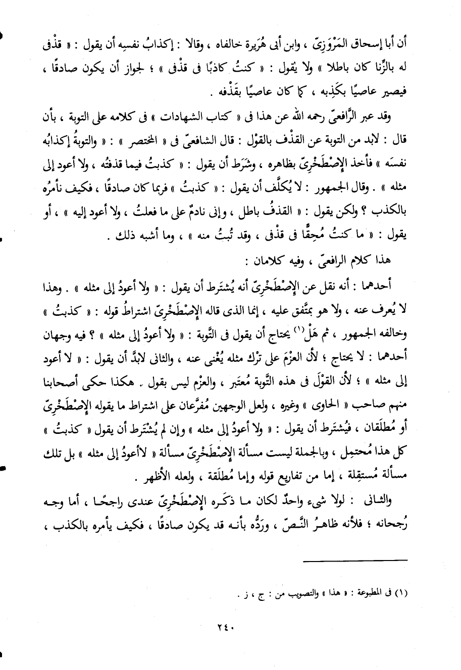 وَقد عبر الرافعى رَحمَه الله عَن هَذَا فى كتاب الشَّهَادَات فى كَلَامه على التَّوْبَة بِأَن قَالَ لابد من التَّوْبَة عَن الْقَذْف بالْقَوْل قَالَ الشافعى فى الْمُخْتَصر وَالتَّوْبَة إكذابه نَفسه فَأخذ الإصطخرى بِظَاهِرِهِ وَشرط أَن يَقُول كذبت فِيمَا قَذَفته وَلَا أَعُود إِلَى مثله وَقَالَ الْجُمْهُور لَا يُكَلف أَن يَقُول كذبت فَرُبمَا كَانَ صَادِقا فَكيف نأمره بِالْكَذِبِ وَلَكِن يَقُول الْقَذْف بَاطِل وإنى نادم على مَا فعلت وَلَا أَعُود إِلَيْهِ أَو يَقُول مَا كنت محقا فى قذفى وَقد تبت مِنْهُ وَمَا أشبه ذَلِك