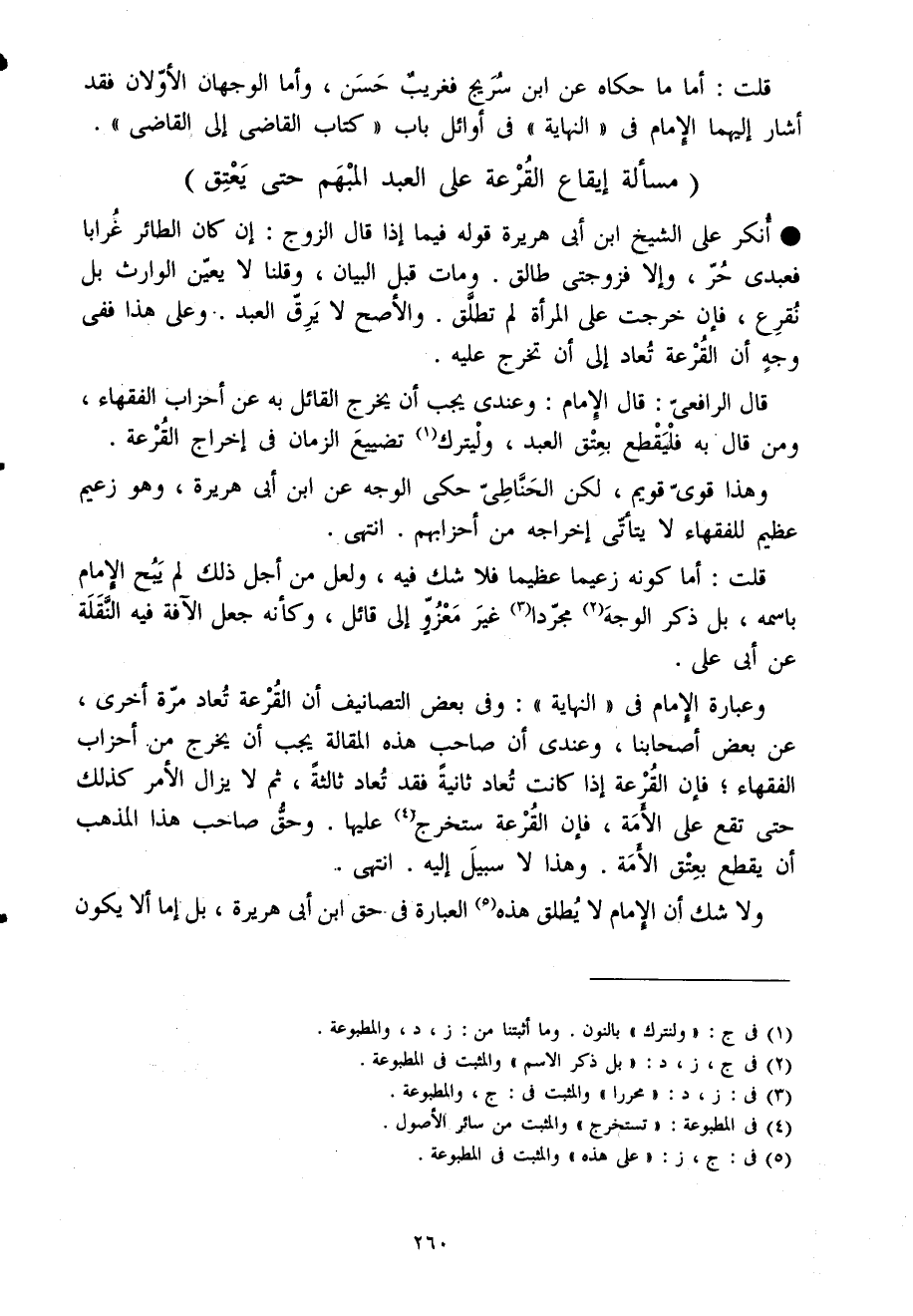 وَعبارَة الإِمَام فى النِّهَايَة وفى بعض التصانيف أَن الْقرعَة تُعَاد مرّة أُخْرَى عَن بعض أَصْحَابنَا وعندى أَن صَاحب هَذِه الْمقَالة يجب أَن يخرج من أحزاب الْفُقَهَاء فَإِن الْقرعَة إِذا كَانَت تُعَاد ثَانِيَة فقد تُعَاد ثَالِثَة ثمَّ لَا يزَال الْأَمر كَذَلِك حَتَّى تقع على الْأمة فَإِن الْقرعَة ستخرج عَلَيْهَا وَحقّ صَاحب هَذَا الْمَذْهَب أَن يقطع بِعِتْق الْأمة وَهَذَا لَا سَبِيل إِلَيْهِ انْتهى