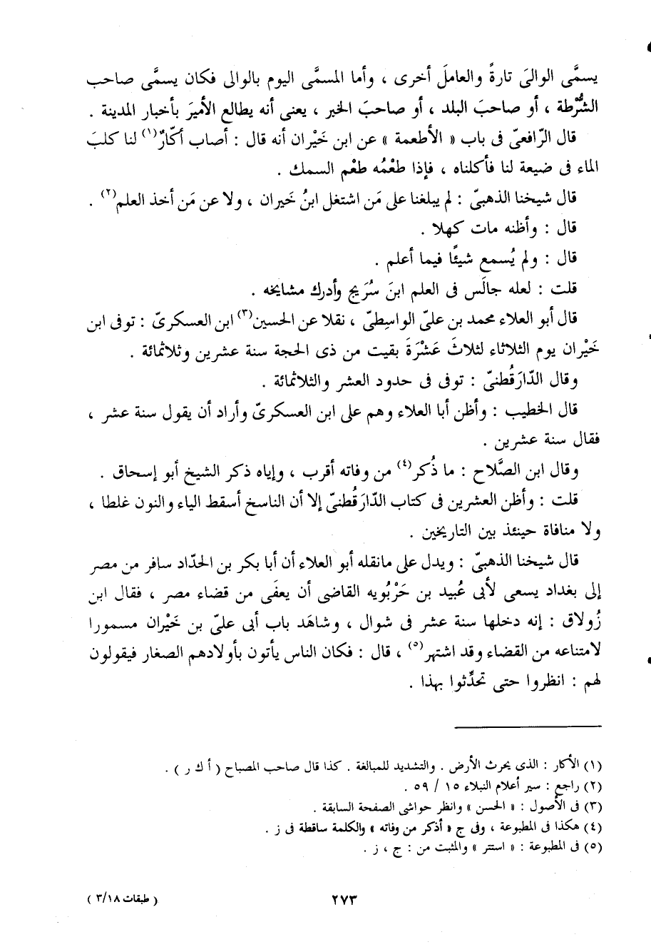 قَالَ شَيخنَا الذهبى وَيدل على مانقله أَبُو الْعَلَاء أَن أَبَا بكر بن الْحداد سَافر من مصر إِلَى بَغْدَاد يسْعَى لأبى عبيد بن حربوية القاضى أَن يُعْفَى من قَضَاء مصر فَقَالَ ابْن زولاق إِنَّه دَخلهَا سنة عشر فى شَوَّال وَشَاهد بَاب أَبى على بن خيران مسمورا لامتناعه من الْقَضَاء وَقد اشْتهر قَالَ فَكَانَ النَّاس يأْتونَ بأولادهم الصغار فَيَقُولُونَ لَهُم انْظُرُوا حَتَّى تحدثُوا بِهَذَا