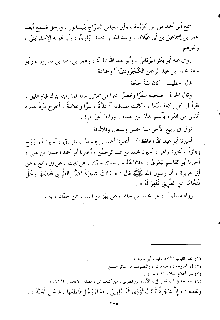 أخبرنَا أَبُو عبد الله الْحَافِظ أخبرنَا أَحْمد بن هبة الله بقراءتى أخبرنَا أَبُو روح إجَازَة أخبرنَا زَاهِر أخبرنَا مُحَمَّد بن عبد الرَّحْمَن أخبرنَا أَبُو أَحْمد الْحُسَيْن بن على أخبرنَا أَبُو الْقَاسِم البغوى حَدثنَا هدبه حَدثنَا حَمَّاد عَن ثَابت عَن أَبى رَافع عَن أَبى هُرَيْرَة أَن رَسُول الله صلى الله عَلَيْهِ وَسلم قَالَ (كَانَت شَجَرَة تضر بِالطَّرِيقِ فقطعها رجل فنحاها عَن الطَّرِيق فغفر لَهُ) رَوَاهُ مُسلم عَن مُحَمَّد بن حَاتِم عَن بهز بن أَسد عَن حَمَّاد بِهِ