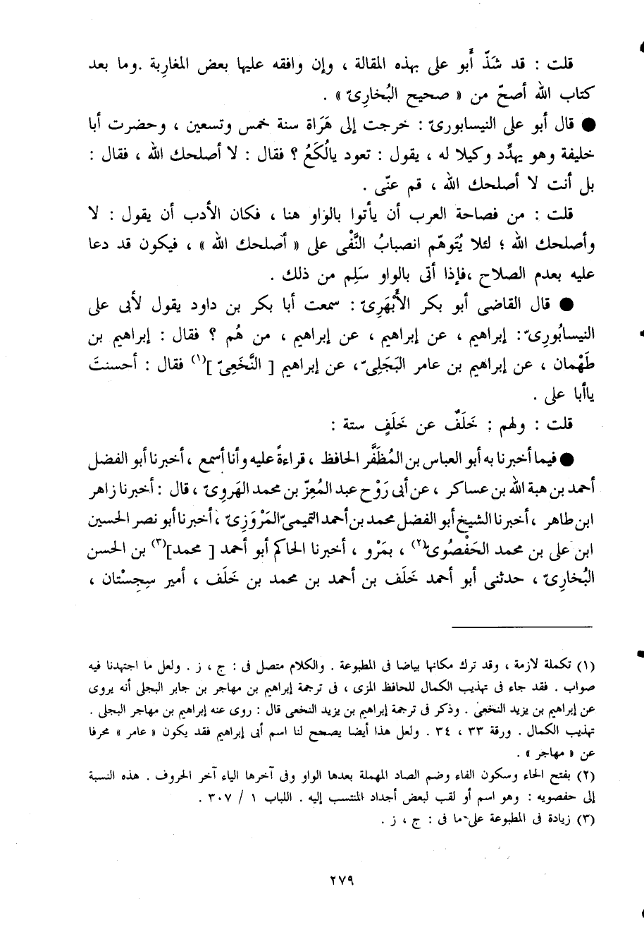 فِيمَا أخبرنَا بِهِ أَبُو الْعَبَّاس بن المظفر الْحَافِظ قِرَاءَة عَلَيْهِ وَأَنا أسمع أخبرنَا أَبُو الْفضل أَحْمد بن هبة الله بن عَسَاكِر عَن أَبى روح عبد الْمعز بن مُحَمَّد الهروى قَالَ أخبرنَا زَاهِر ابْن طَاهِر أخبرنَا الشَّيْخ أَبُو الْفضل مُحَمَّد بن أَحْمد التميمى المروزى أخبرنَا أَبُو نصر الْحُسَيْن ابْن على بن مُحَمَّد الحفصوى بمرو أخبرنَا الْحَاكِم أَبُو أَحْمد مُحَمَّد بن الْحسن البخارى حَدَّثَنى أَبُو أَحْمد خلف بن أَحْمد بن مُحَمَّد بن خلف أَمِير سجستان