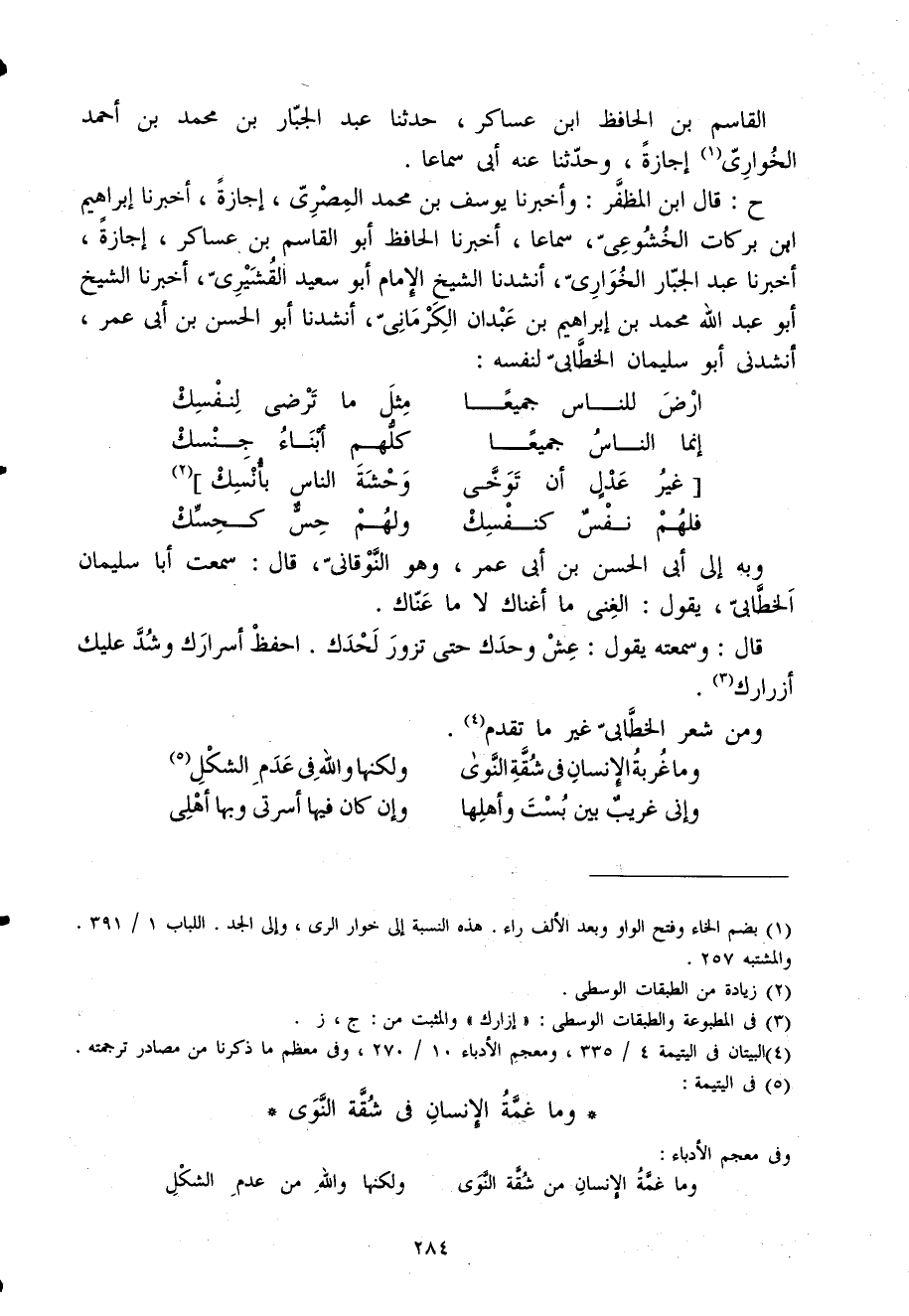 ح قَالَ ابْن المظفر وَأخْبرنَا يُوسُف بن مُحَمَّد المصرى إجَازَة أخبرنَا إِبْرَاهِيم ابْن بَرَكَات الخشوعى سَمَاعا أخبرنَا الْحَافِظ أَبُو الْقَاسِم بن عَسَاكِر إجَازَة أخبرنَا عبد الْجَبَّار الخوارى أنشدنا الشَّيْخ الإِمَام أَبُو سعيد القشيرى أخبرنَا الشَّيْخ أَبُو عبد الله مُحَمَّد بن إِبْرَاهِيم بن عَبْدَانِ الكرمانى أنشدنا أَبُو الْحسن بن أَبى عمر أنشدنى أَبُو سُلَيْمَان الخطابى لنَفسِهِ