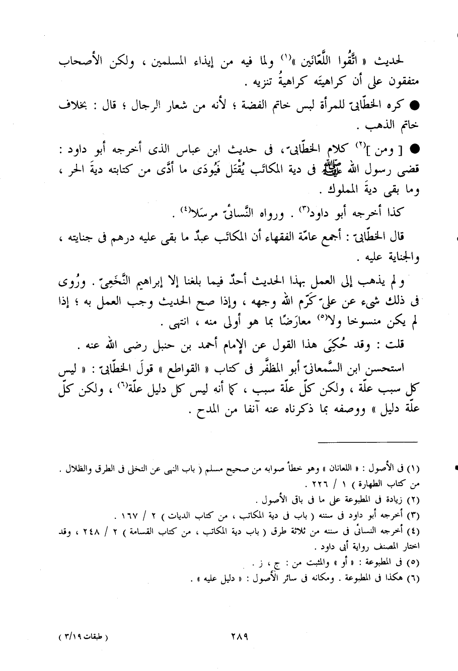 وَمن كَلَام الخطابى فى حَدِيث ابْن عَبَّاس الذى أخرجه أَبُو دَاوُد قضى رَسُول الله صلى الله عَلَيْهِ وَسلم فى دِيَة الْمكَاتب يقتل فيودى مَا أدّى من كِتَابَته دِيَة الْحر وَمَا بقى دِيَة الْمَمْلُوك