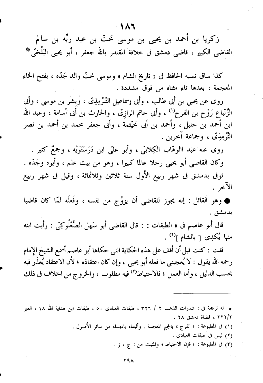 186 - زَكَرِيَّا بن أَحْمد بن يحيى بن مُوسَى خت بن عبد ربه بن سَالم القاضى الْكَبِير قاضى دمشق فى خلَافَة المقتدر بِاللَّه جَعْفَر أَبُو يحيى البلخى