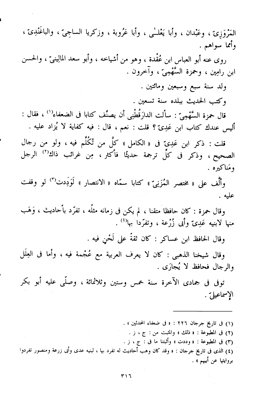 وَقَالَ حَمْزَة كَانَ حَافِظًا متقنا لم يكن فى زَمَانه مثله تفرد بِأَحَادِيث وهب مِنْهَا لابْنَيْهِ عدى وأبى زرْعَة وتفردا بهَا