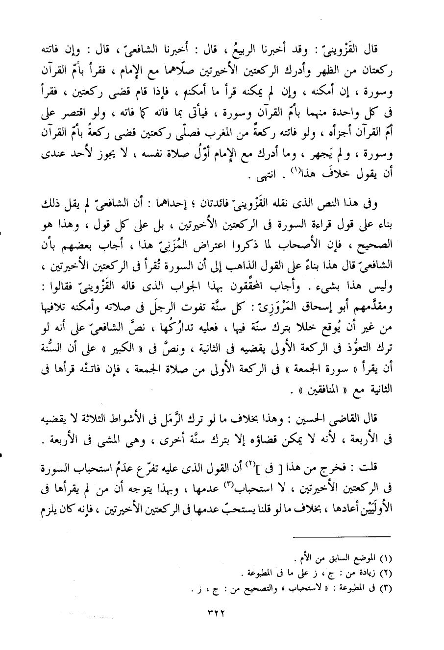 وفى هَذَا النَّص الذى نَقله القزوينى فَائِدَتَانِ إِحْدَاهمَا أَن الشافعى لم يقل ذَلِك بِنَاء على قَول قِرَاءَة السُّورَة فى الرَّكْعَتَيْنِ الْأَخِيرَتَيْنِ بل على كل قَول وَهَذَا هُوَ الصَّحِيح فَإِن الْأَصْحَاب لما ذكرُوا اعْتِرَاض المزنى هَذَا أجَاب بَعضهم بِأَن الشافعى قَالَ هَذَا بِنَاء على القَوْل الذَّاهِب إِلَى أَن السُّورَة تقْرَأ فى الرَّكْعَتَيْنِ الْأَخِيرَتَيْنِ وَلَيْسَ هَذَا بشئ وَأجَاب الْمُحَقِّقُونَ بِهَذَا الْجَواب الذى قَالَه القزوينى فَقَالُوا ومقدمهم أَبُو إِسْحَاق المروزى كل سنة تفوت الرجل فى صلَاته وَأمكنهُ تلافيها من غير أَن يُوقع خللا بترك سنة فِيهَا فَعَلَيهِ تداركها نَص الشافعى على أَنه لَو ترك التَّعَوُّذ فى الرَّكْعَة الأولى يَقْضِيه فى الثَّانِيَة وَنَصّ فى الْكَبِير على أَن السّنة أَن يقْرَأ سُورَة الْجُمُعَة فى الرَّكْعَة الأولى من صَلَاة الْجُمُعَة فَإِن فَاتَتْهُ قَرَأَهَا فى الثَّانِيَة مَعَ الْمُنَافِقين