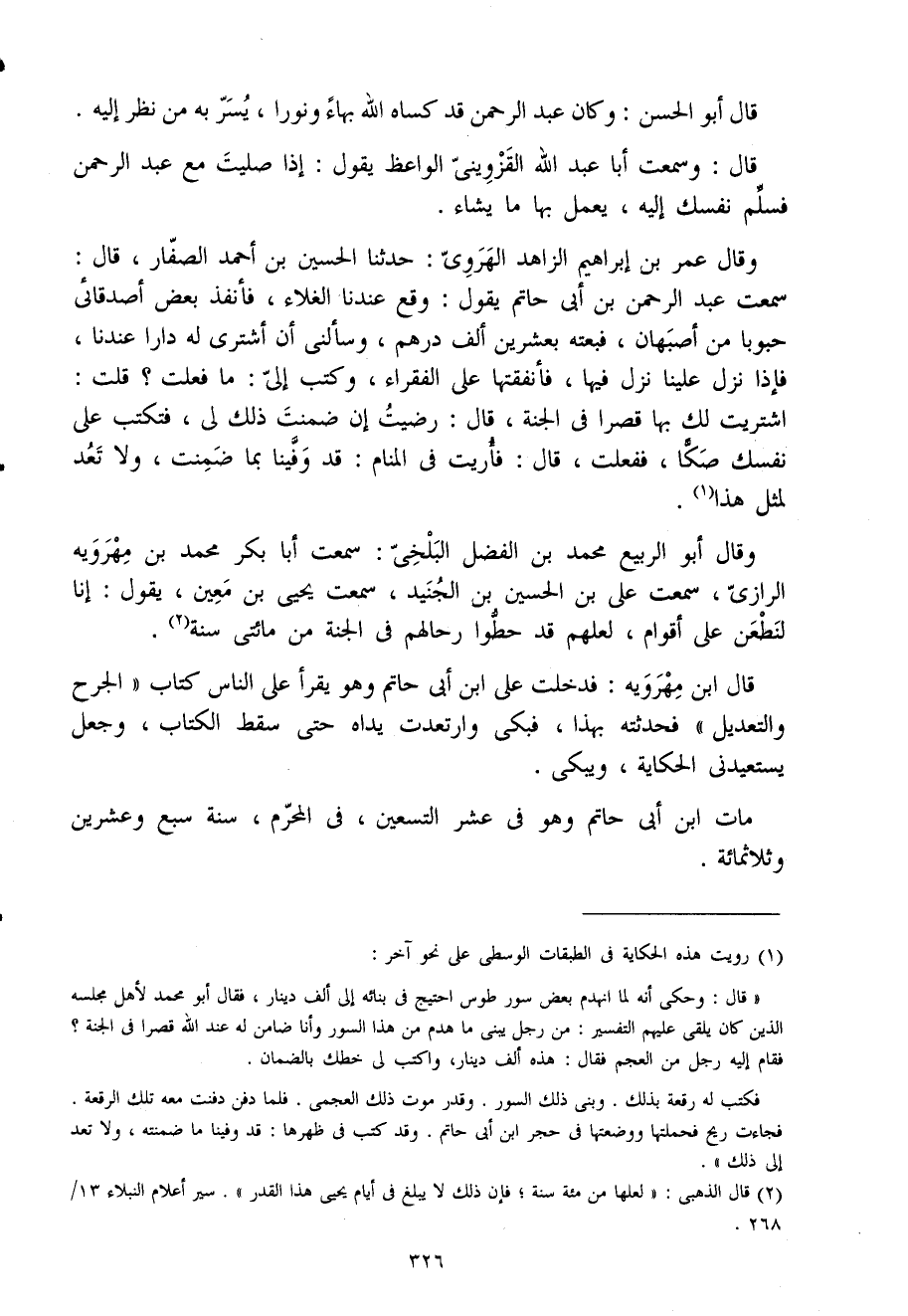 وَقَالَ عمر بن إِبْرَاهِيم الزَّاهِد الهروى حَدثنَا الْحُسَيْن بن أَحْمد الصفار قَالَ سَمِعت عبد الرَّحْمَن بن أَبى حَاتِم يَقُول وَقع عندنَا الغلاء فأنفذ بعض أصدقائى حبوبا من أَصْبَهَان فَبِعْته بِعشْرين ألف دِرْهَم وسألنى أَن أشترى لَهُ دَارا عندنَا فَإِذا نزل علينا نزل فِيهَا فأنفقتها على الْفُقَرَاء وَكتب إِلَى مَا فعلت قلت اشْتريت لَك بهَا قصرا فى الْجنَّة قَالَ رضيت إِن ضمنت ذَلِك لى فتكتب على نَفسك صكا فَفعلت قَالَ فَأريت فى الْمَنَام قد وَفينَا بِمَا ضمنت وَلَا تعد لمثل هَذَا