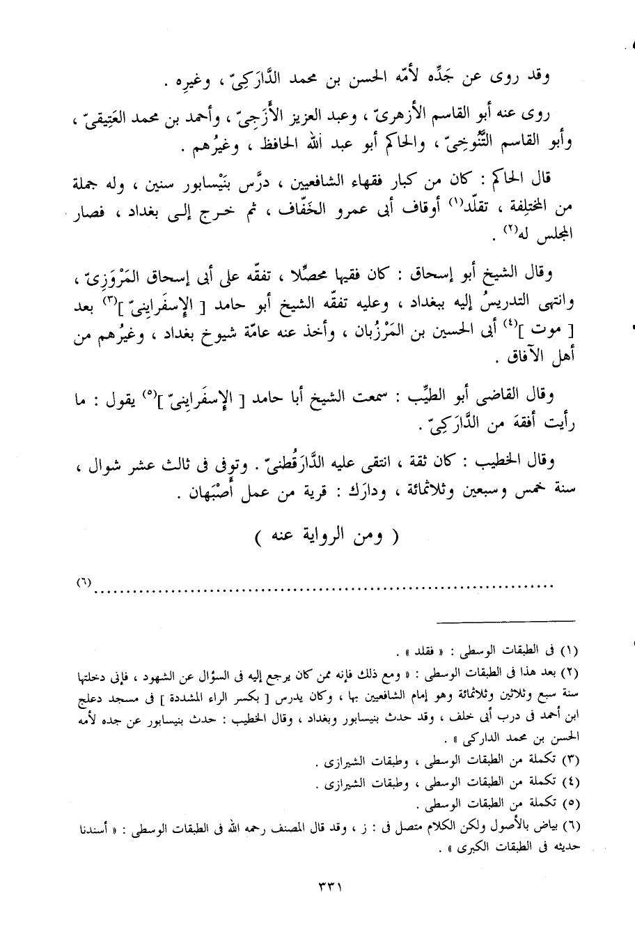 وَقَالَ القاضى أَبُو الطّيب سَمِعت الشَّيْخ أَبَا حَامِد الإسفراينى يَقُول مَا رَأَيْت أفقه من الداركى