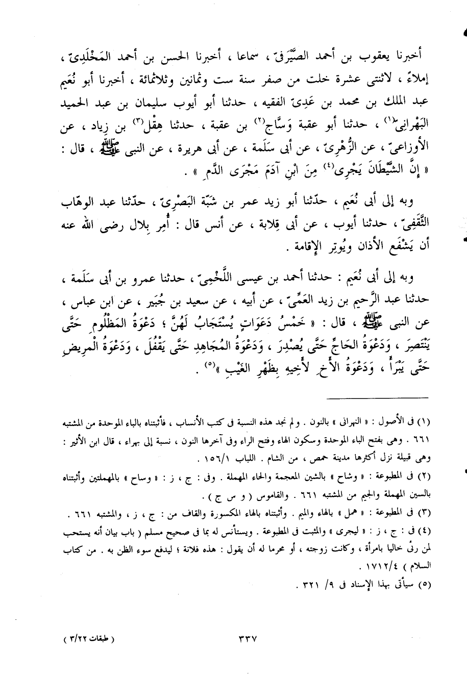 أخبرنَا يَعْقُوب بن أَحْمد الصيرفى سَمَاعا أخبرنَا الْحسن بن أَحْمد المخلدى إملاء لاثنتى عشرَة خلت من صفر سنة سِتّ وَثَمَانِينَ وثلاثمائة أخبرنَا أَبُو نعيم عبد الْملك بن مُحَمَّد بن عدى الْفَقِيه حَدثنَا أَبُو أَيُّوب سُلَيْمَان بن عبد الحميد البهرانى حَدثنَا أَبُو عقبَة وساج بن عقبَة حَدثنَا هِقْل بن زِيَاد عَن الأوزاعى عَن الزهرى عَن أَبى سَلمَة عَن أَبى هُرَيْرَة عَن النبى صلى الله عَلَيْهِ وَسلم قَالَ (إِن الشَّيْطَان يجرى من ابْن آدم مجْرى الدَّم)