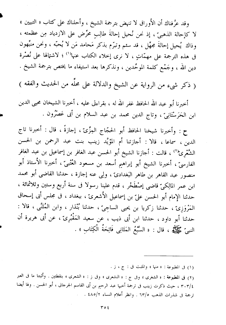 وَقد عرفناك أَن الأوراق لَا تنهض بترجمة الشَّيْخ وأحلناك على كتاب التَّبْيِين لَا كإحالة الذهبى إِذْ نَحن نحيل إِحَالَة طَالب محرض على الازدياد من عَظمته وَذَاكَ يحِيل إِحَالَة مجهل قد سئم وتبرم بِذكر محامد من لَا يُحِبهُ وَنحن منبهون فى هَذِه التَّرْجَمَة على مهمات لَا نرى إخلاء الْكتاب عَنْهَا لاشتمالها على نصْرَة دين الله وَجمع كلمة الْمُوَحِّدين ونذكرها بعد اسْتِيفَاء مَا يخْتَص بترجمة الشَّيْخ