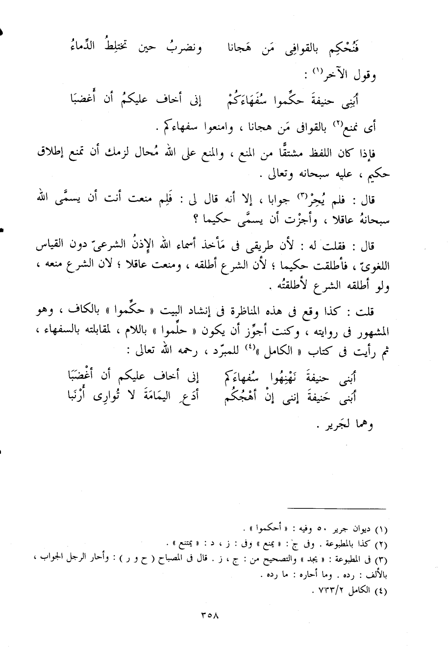 قلت كَذَا وَقع فى هَذِه المناظرة فى إنشاد الْبَيْت حكمُوا بِالْكَاف وَهُوَ الْمَشْهُور فى رِوَايَته وَكنت أجوز أَن يكون حلموا بِاللَّامِ لمقابلته بالسفهاء ثمَّ رَأَيْت فى كتاب الْكَامِل للمبرد رَحمَه الله تَعَالَى