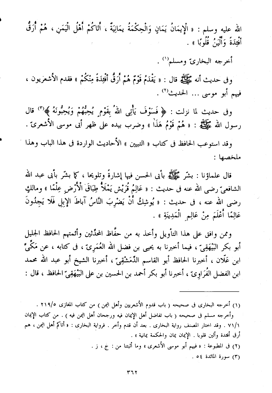 وَمِمَّنْ وَافق على هَذَا التَّأْوِيل وَأخذ بِهِ من حفاظ الْمُحدثين وأئمتهم الْحَافِظ الْجَلِيل أَبُو بكر البيهقى فِيمَا أخبرنَا بِهِ يحيى بن فضل الله الْعُمْرَى فى كِتَابه عَن مكى ابْن عَلان أخبرنَا الْحَافِظ أَبُو الْقَاسِم الدمشقى أخبرنَا الشَّيْخ أَبُو عبد الله مُحَمَّد ابْن الْفضل الفراوى أخبرنَا أَبُو بكر أَحْمد بن الْحُسَيْن بن على البيهقى الْحَافِظ قَالَ