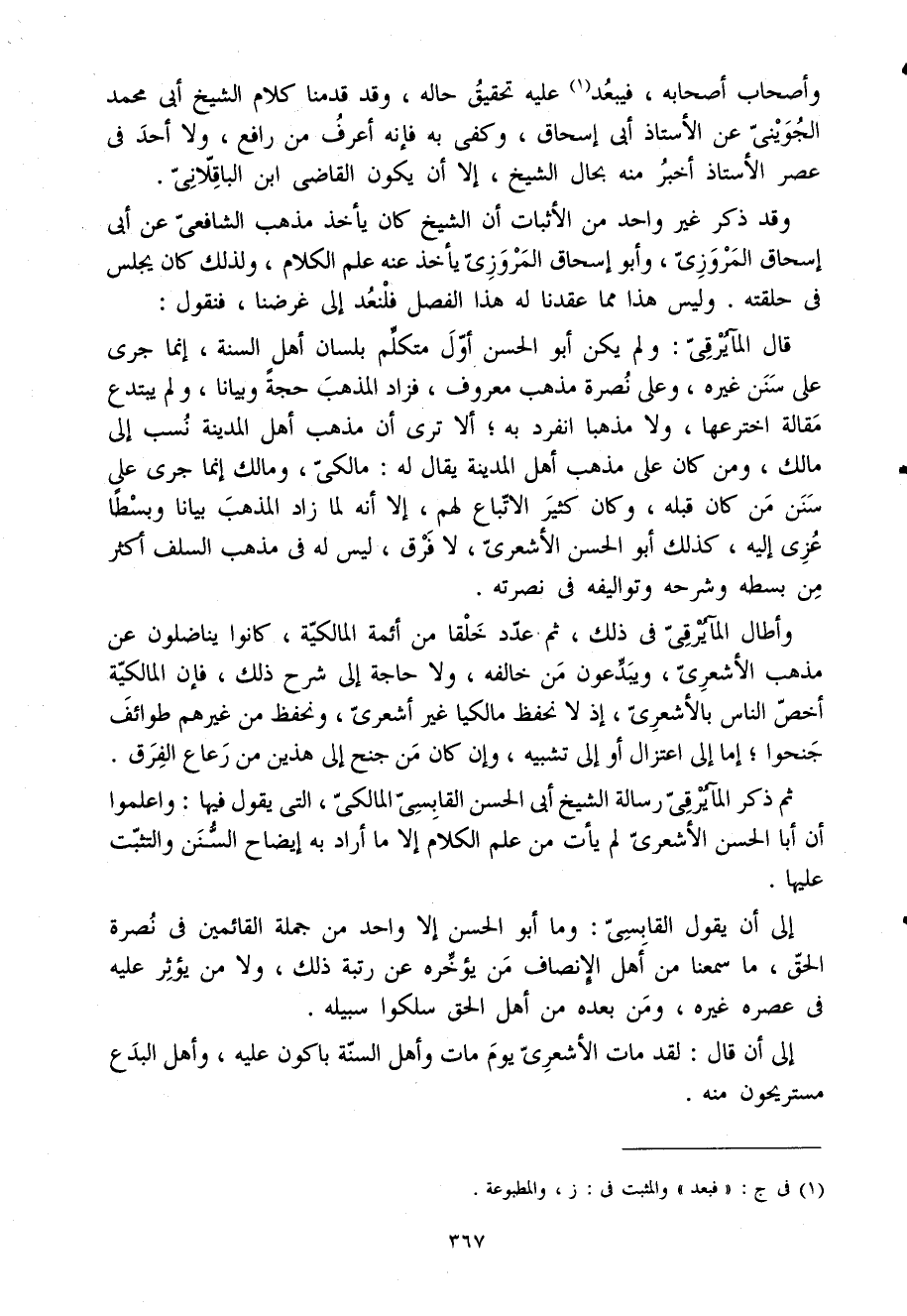 وَقد ذكر غير وَاحِد من الْأَثْبَات أَن الشَّيْخ كَانَ يَأْخُذ مَذْهَب الشافعى عَن أَبى إِسْحَاق المروزى وَأَبُو إِسْحَاق المروزى يَأْخُذ عَنهُ علم الْكَلَام وَلذَلِك كَانَ يجلس فى حلقته وَلَيْسَ هَذَا مِمَّا عَقدنَا لَهُ هَذَا الْفَصْل فلنعد إِلَى غرضنا فَنَقُول قَالَ المآيرقى وَلم يكن أَبُو الْحسن أول مُتَكَلم بِلِسَان أهل السّنة إِنَّمَا جرى على سنَن غَيره وعَلى نصْرَة مَذْهَب مَعْرُوف فَزَاد الْمَذْهَب حجَّة وبيانا وَلم يبتدع مقَالَة اخترعها وَلَا مذهبا انْفَرد بِهِ أَلا ترى أَن مَذْهَب أهل الْمَدِينَة نسب إِلَى مَالك وَمن كَانَ على مَذْهَب أهل الْمَدِينَة يُقَال لَهُ مالكى وَمَالك إِنَّمَا جرى على سنَن من كَانَ قبله وَكَانَ كثير الِاتِّبَاع لَهُم إِلَّا أَنه لما زَاد الْمَذْهَب بَيَانا وبسطا عزى إِلَيْهِ كَذَلِك أَبُو الْحسن الأشعرى لَا فرق لَيْسَ لَهُ فى مَذْهَب السّلف أَكثر من بَسطه وَشَرحه وتواليفه فى نصرته