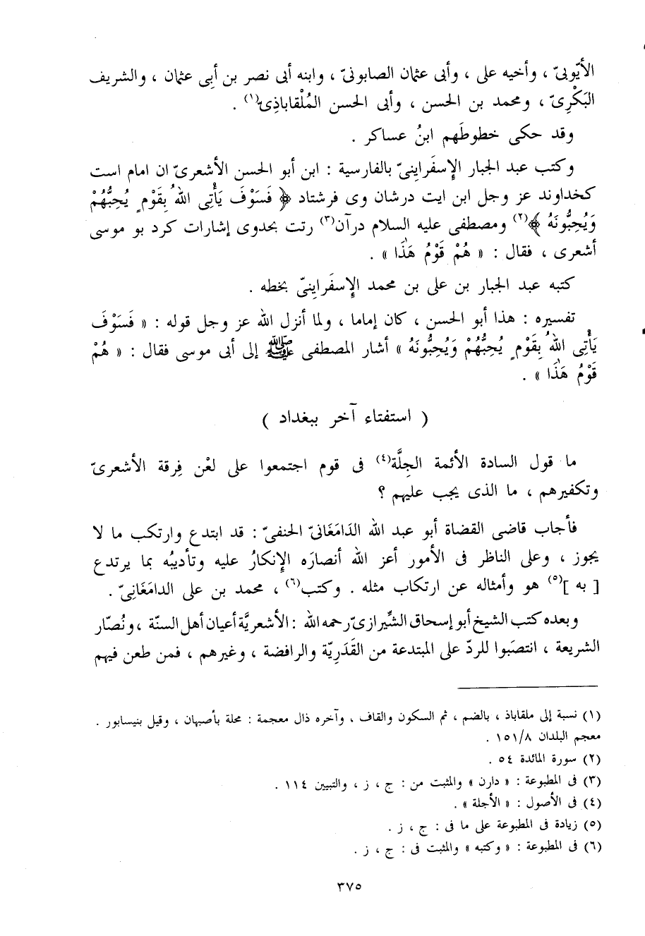 مَا قَول السَّادة الْأَئِمَّة الجلة فِي قوم اجْتَمعُوا على لعن فرقة الأشعرى وتكفيرهم مَا الذى يجب عَلَيْهِم فَأجَاب قاضى الْقُضَاة أَبُو عبد الله الدامغانى الحنفى قد ابتدع وارتكب مَا لَا يجوز وعَلى النَّاظر فى الْأُمُور أعز الله أنصاره الْإِنْكَار عَلَيْهِ وتأديبه بِمَا يرتدع بِهِ هُوَ وَأَمْثَاله عَن ارْتِكَاب مثله وَكتب مُحَمَّد بن على الدامغانى