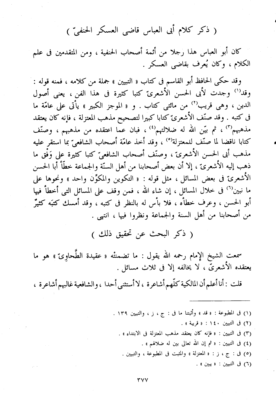 وَقد حكى الْحَافِظ أَبُو الْقَاسِم فى كتاب التَّبْيِين جملَة من كَلَامه فَمِنْهُ قَوْله وَقد وجدت لأبى الْحسن الأشعرى كتبا كَثِيرَة فى هَذَا الْفَنّ يعْنى أصُول الدّين وهى قريب من مائتى كتاب والموجز الْكَبِير يأتى على عَامَّة مَا فى كتبه وَقد صنف الأشعرى كتابا كَبِيرا لتصحيح مَذْهَب الْمُعْتَزلَة فَإِنَّهُ كَانَ يعْتَقد مَذْهَبهم ثمَّ بَين الله لَهُ ضلالتهم فَبَان عَمَّا اعتقده من مَذْهَبهم وصنف كتابا ناقضا لما صنف للمعتزلة وَقد أَخذ عَامَّة أَصْحَاب الشافعى بِمَا اسْتَقر عَلَيْهِ مَذْهَب أَبى الْحسن الأشعرى وصنف أَصْحَاب الشافعى كتبا كَثِيرَة على وفْق مَا ذهب إِلَيْهِ الأشعرى إِلَّا أَن بعض أَصْحَابنَا من أهل السّنة وَالْجَمَاعَة خطأ أَبَا الْحسن الأشعرى فى بعض الْمسَائِل مثل قَوْله التكوين والمكون وَاحِد وَنَحْوهَا على مَا نبين فى خلال الْمسَائِل إِن شَاءَ الله فَمن وقف على الْمسَائِل الَّتِى أَخطَأ فِيهَا أَبُو الْحسن وَعرف خطأه فَلَا بَأْس لَهُ بِالنّظرِ فى كتبه وَقد أمسك كتبه كثير من أَصْحَابنَا من أهل السّنة وَالْجَمَاعَة ونظروا فِيهَا انْتهى