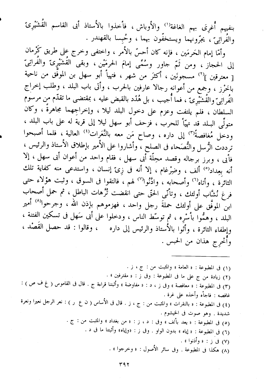 وَأما إِمَام الْحَرَمَيْنِ فَإِنَّهُ كَانَ أحس بِالْأَمر واختفى وَخرج على طَرِيق كرمان الى الْحجاز وَمن ثمَّ جاور وَسمي إِمَام الْحَرَمَيْنِ وَبَقِي الْقشيرِي والفراتي معترقين مسجونين أَكثر من شهر فتهيأ أَبُو سهل بن الْمُوفق من نَاحيَة باخرز وَجمع من أعوانه رجَالًا عارفين بِالْحَرْبِ وأتى بَاب الْبَلَد وَطلب إِخْرَاج الفراتى والقشيرى فَمَا أُجِيب بل هدد بِالْقَبْضِ عَلَيْهِ بِمُقْتَضى مَا تقدم من مرسوم السُّلْطَان فَلم يلْتَفت وعزم على دُخُول الْبَلَد لَيْلًا وإخراجهما مجاهرة وَكَانَ متولى الْبَلَد قد تهَيَّأ للحرب فزحف أَبُو سهل لَيْلًا إِلَى قَرْيَة لَهُ على بَاب الْبَلَد وَدخل مغافصة إِلَى دَاره وَصَاح من مَعَه بالنعرات الْعَالِيَة فَلَمَّا أَصْبحُوا ترددت الرُّسُل والنصحاء فى الصُّلْح وأشاروا على الْأَمِير بِإِطْلَاق الْأُسْتَاذ والرئيس فَأبى وبرز بِرِجَالِهِ وَقصد محلّة أَبى سهل فَقَامَ وَاحِد من أعوان أَبى سهل إِلَّا أَنه بعداد ألف وضرغام إِلَّا أَنه فى زى إِنْسَان واستدعى مِنْهُ كِفَايَة تِلْكَ الثائرة وَأَتَاهُ وَأَصْحَابه وادنوا لَهُم فَالْتَقوا فى السُّوق وَثَبت هَؤُلَاءِ حَتَّى فرغ نشاب أُولَئِكَ وتأنى الْحق حَتَّى انْقَضتْ ترهات الْبَاطِل ثمَّ حمل أَصْحَاب ابْن الْمُوفق على أُولَئِكَ حَملَة رجل وَاحِد فهزموهم بِإِذن الله وجرحوا أَمِير الْبَلَد وهمو بأسره ثمَّ توَسط النَّاس ودخلوا على أَبى سهل فى تسكين الْفِتْنَة وإطفاء الثائرة وَأتوا بالأستاذ والرئيس إِلَى دَاره وَقَالُوا قد حصل الْقَصْد وَأخرج هَذَانِ من الْحَبْس
