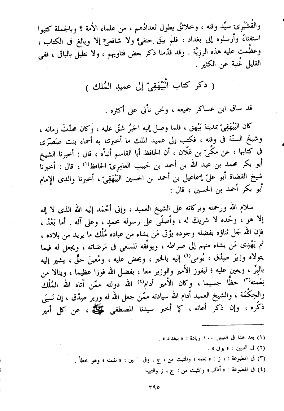 ذكر كتاب البيهقى إِلَى عميد الْملك