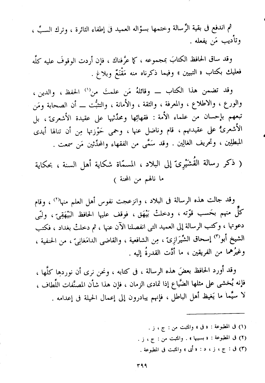 وَقد جالت هَذِه الرسَالَة فى الْبِلَاد وانزعجت نفوس أهل الْعلم مِنْهَا وَقَامَ كل مِنْهُم بِحَسب قوته وَدخلت بيهق فَوقف عَلَيْهَا الْحَافِظ البيهقى ولبى دعوتها وَكتب الرسَالَة إِلَى العميد الَّتِى انفصلنا الْآن عَنْهَا ثمَّ دخلت بَغْدَاد فَكتب الشَّيْخ أَبُو إِسْحَاق الشيرازى من الشَّافِعِيَّة والقاضى الدامغانى من الْحَنَفِيَّة وَغَيرهمَا من الْفَرِيقَيْنِ مَا أدَّت الْقُدْرَة إِلَيْهِ