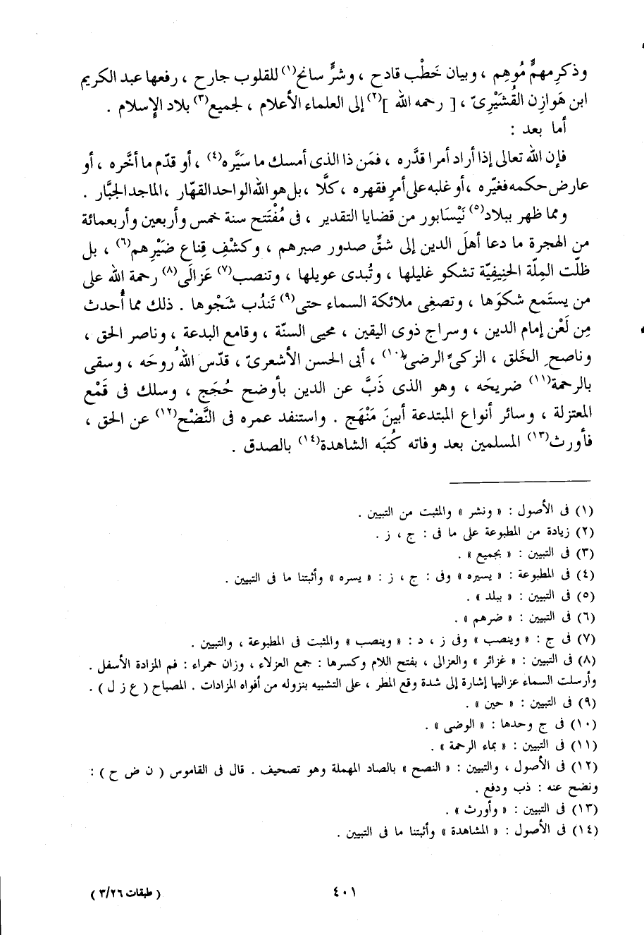 وذكرمهم موهم وَبَيَان خطب قَادِح وَشر سانح للقلوب جارح رَفعهَا عبد الْكَرِيم ابْن هوَازن القشيرى رَحمَه الله إِلَى الْعلمَاء الْأَعْلَام لجَمِيع بِلَاد الْإِسْلَام