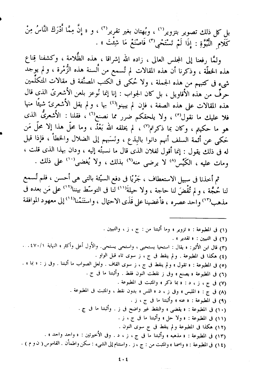 وَلما رفعنَا إِلَى الْمجْلس العالى زَاده الله إشراقا هَذِه الظلامة وكشفنا قناع هَذِه الخطة وَذكرنَا أَن هَذِه المقالات لم تسمع من أَلْسِنَة هَذِه الزمرة وَلم يُوجد شئ فى كتبهمْ من هَذِه الْجُمْلَة وَلَا حكى فى الْكتب المصنفة فى مقالات الْمُتَكَلِّمين حرف من هَذِه الْأَقَاوِيل بل كَانَ الْجَواب إِنَّا إِنَّمَا نوعز بلعن الأشعرى الذى قَالَ هَذِه المقالات على هَذِه الصّفة فَإِن لم يبينوا بهَا وَلم يقل الأشعرى شَيْئا مِنْهَا فَلَا عَلَيْك مَا نقُول وَلَا يلحقكم ضَرَر مِمَّا نصْنَع فَقُلْنَا الأشعرى الذى هُوَ مَا حكيتم وَكَانَ بِمَا ذكرْتُمْ لم يخلقه الله بعد وَمَا مَحل هَذَا إِلَّا مَحل من حكى عَن أَئِمَّة السّلف أَنهم دانوا بالبدع ونسبهم إِلَى الضلال وَالْخَطَأ فَإِذا قيل لَهُ فى ذَلِك يَقُول إِنَّمَا أَقُول لفُلَان الذى قَالَ مَا نسبته إِلَيْهِ ودان بِهَذَا الذى قلت وَمَات عَلَيْهِ الْكيس لَا يرضى مِنْهُ بذلك وَلَا يغضى على ذَلِك