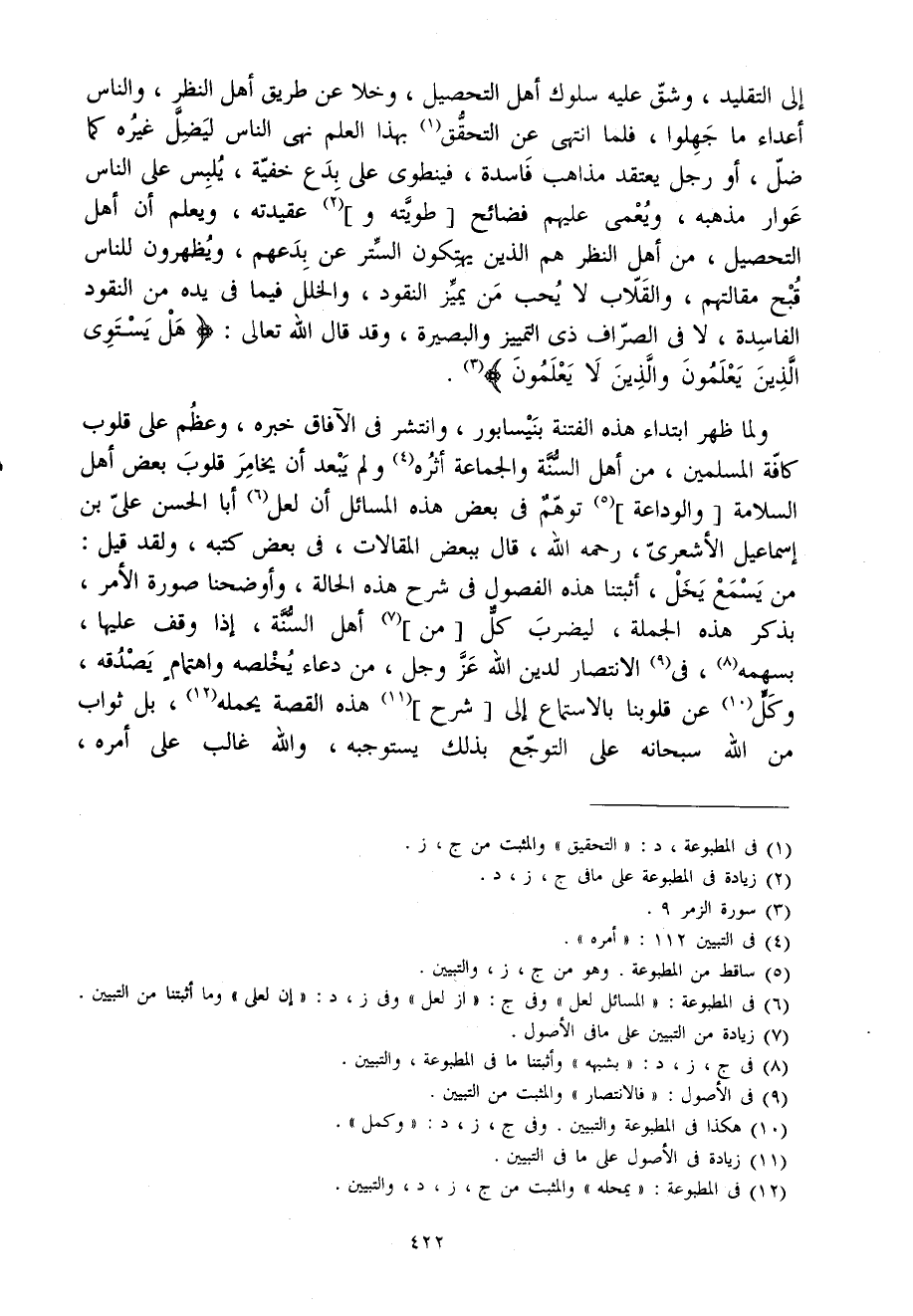 وَلما ظهر ابْتِدَاء هَذِه الْفِتْنَة بنيسابور وانتشر فى الْآفَاق خَبره وَعظم على قُلُوب كَافَّة الْمُسلمين من أهل السّنة وَالْجَمَاعَة أَثَره وَلم يبعد أَن يخَامر قُلُوب بعض أهل السَّلامَة والوداعة توهم فى بعض هَذِه الْمسَائِل أَن لَعَلَّ أَبَا الْحسن على بن إِسْمَاعِيل الأشعرى رَحمَه الله قَالَ بِبَعْض المقالات فى بعض كتبه وَلَقَد قيل من يسمع يخل أثبتنا هَذِه الْفُصُول فى شرح هَذِه الْحَالة وأوضحنا صُورَة الْأَمر بِذكر هَذِه الْجُمْلَة ليضْرب كل من أهل السّنة إِذا وقف عَلَيْهَا بسهمه فى الِانْتِصَار لدين الله عز وَجل من دُعَاء يخلصه واهتمام يصدقهُ وكل عَن قُلُوبنَا بالاستماع إِلَى شرح هَذِه الْقِصَّة يحلمه بل ثَوَاب من الله سُبْحَانَهُ على التوجع بذلك يستوجبه وَالله غَالب على أمره