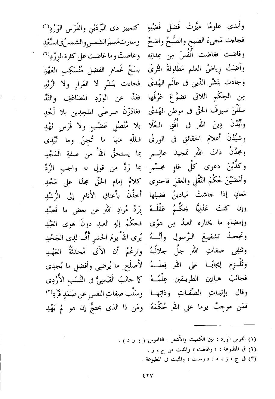 وَأبْدى علوما ميزت فضل فَضله ... كتمييز ذى البردين وَالْفرس الْورْد)