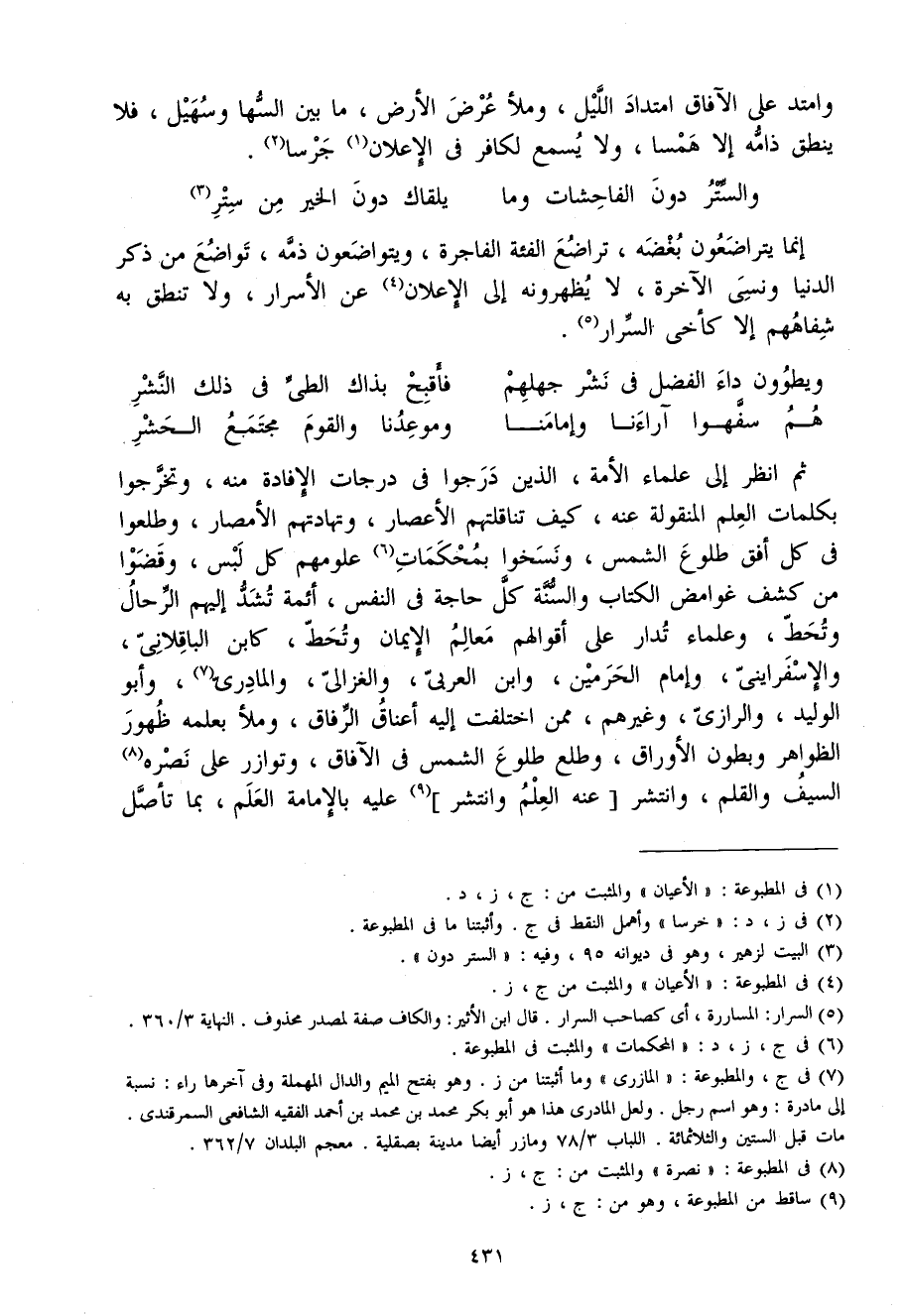 ثمَّ انْظُر إِلَى عُلَمَاء الْأمة الَّذين درجوا فى دَرَجَات الإفادة مِنْهُ وتخرجوا بِكَلِمَات الْعلم المنقولة عَنهُ كَيفَ تناقلتهم الْأَعْصَار وتهادتهم الْأَمْصَار وطلعوا فى كل أفق طُلُوع الشَّمْس ونسخوا بمحكمات علومهم كل لبس وقضوا من كشف غوامض الْكتاب وَالسّنة كل حَاجَة فى النَّفس أَئِمَّة تشد إِلَيْهِم الرّحال وتحط وعلماء تدار على أَقْوَالهم معالم الْإِيمَان وتحط كَابْن الباقلانى والإسفراينى وَإِمَام الْحَرَمَيْنِ وَابْن العربى والغزالى والمادرى وَأَبُو الْوَلِيد والرازى وَغَيرهم مِمَّن اخْتلفت إِلَيْهِ أَعْنَاق الرفاق وملأ بِعِلْمِهِ ظُهُور الظَّوَاهِر وبطون الأوراق وطلع طُلُوع الشَّمْس فى الْآفَاق وتوازر على نَصره السَّيْف والقلم وانتشر عَنهُ الْعلم وانتشر عَلَيْهِ بِالْإِمَامَةِ الْعلم بِمَا تأصل