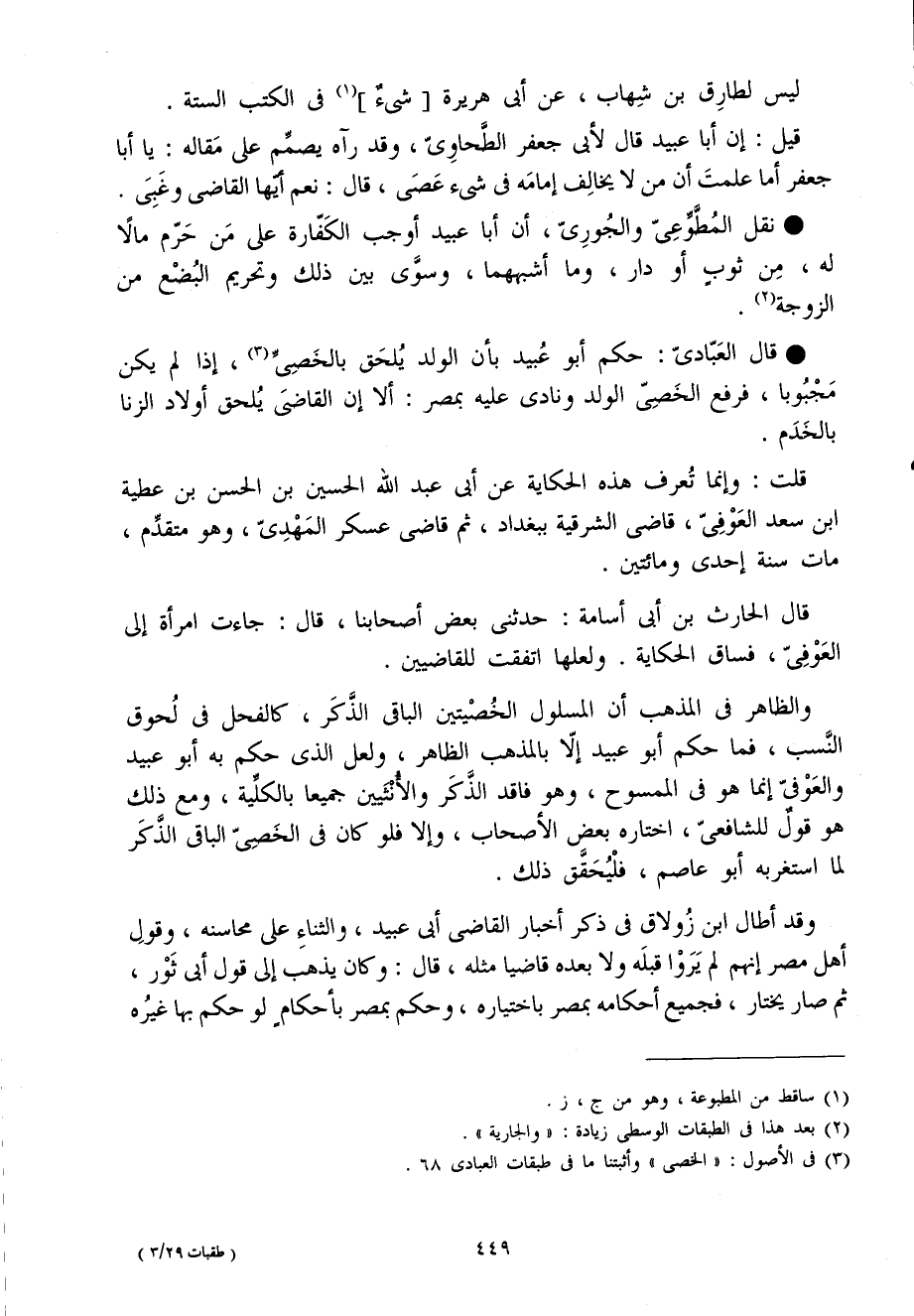 وَقد أَطَالَ ابْن زولاق فى ذكر أَخْبَار القاضى أَبى عبيد وَالثنَاء على محاسنه وَقَول أهل مصر إِنَّهُم لم يرَوا قبله وَلَا بعده قَاضِيا مثله قَالَ وَكَانَ يذهب إِلَى قَول أَبى ثَوْر ثمَّ صَار يخْتَار فَجَمِيع أَحْكَامه بِمصْر بِاخْتِيَارِهِ وَحكم بِمصْر بِأَحْكَام لَو حكم بهَا غَيره