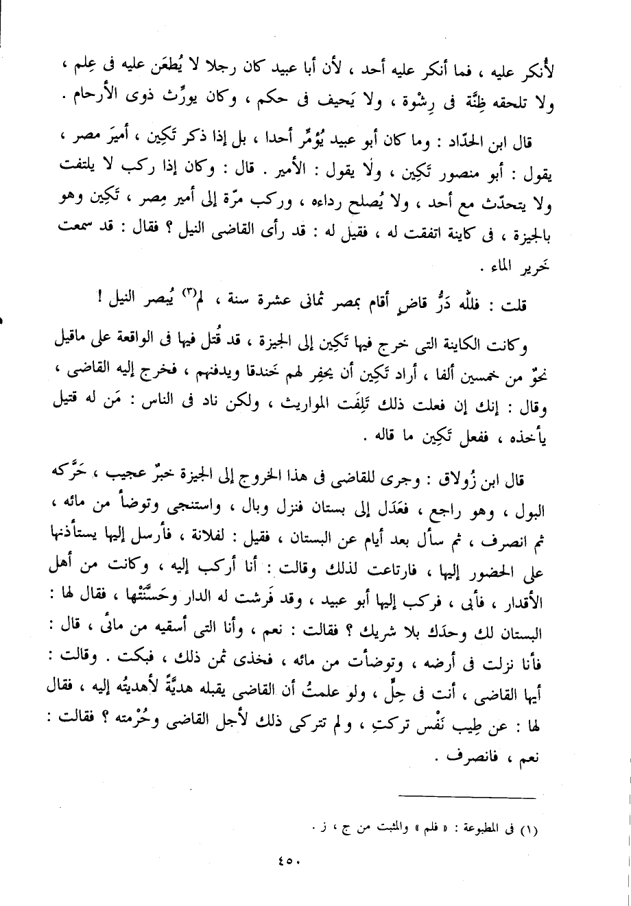 قلت فَللَّه در قَاض أَقَامَ بِمصْر ثمانى عشرَة سنة لم يبصر النّيل وَكَانَت الكاينة الَّتِى خرج فِيهَا تكين إِلَى الجيزة قد قتل فِيهَا فى الْوَاقِعَة على ماقيل نَحْو من خمسين ألفا أَرَادَ تكين أَن يحْفر لَهُم خَنْدَقًا ويدفنهم فَخرج إِلَيْهِ القاضى وَقَالَ إِنَّك إِن فعلت ذَلِك تلفت الْمَوَارِيث وَلَكِن نَاد فى النَّاس من لَهُ قَتِيل يَأْخُذهُ فَفعل تكين مَا قَالَه