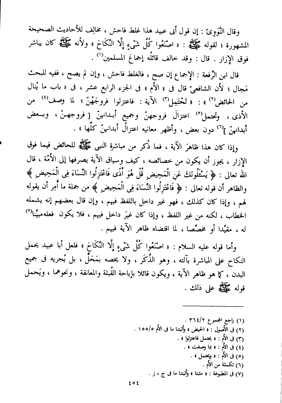 وَقَالَ النووى إِن قَول أَبى عبيد هَذَا غلط فَاحش مُخَالف للأحاديث الصَّحِيحَة الْمَشْهُورَة لقَوْله صلى الله عَلَيْهِ وَسلم (اصنعوا كل شىء إِلَّا النِّكَاح) وَلِأَنَّهُ صلى الله عَلَيْهِ وَسلم كَانَ يُبَاشر فَوق الْإِزَار قَالَ وَقد خَالف قَائِله إِجْمَاع الْمُسلمين