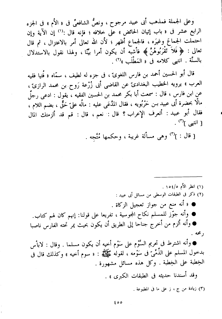 وعَلى الْجُمْلَة فمذهب أَبى عبيد مَرْجُوح وَنَصّ الشافعى فى الْأُم فى الْجُزْء الرَّابِع عشر فى بَاب إتْيَان الْحَائِض على خِلَافه فَإِنَّهُ قَالَ إِن الْآيَة وَإِن احتملت الْجِمَاع وَغَيره فالجماع أظهر لِأَن الله تَعَالَى أَمر بالاعتزال ثمَّ قَالَ تَعَالَى {وَلَا تقربوهن} فَأشبه أَن يكون أمرا بَينا وَلِهَذَا نقُول بالاستدلال بِالسنةِ انْتهى كَلَامه فى الْمطلب