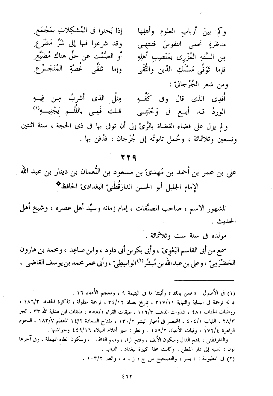229 - على بن عمر بن أَحْمد بن مهدى بن مَسْعُود بن النُّعْمَان بن دِينَار بن عبد الله الإِمَام الْجَلِيل أَبُو الْحسن الدارقطنى البغدادى الْحَافِظ