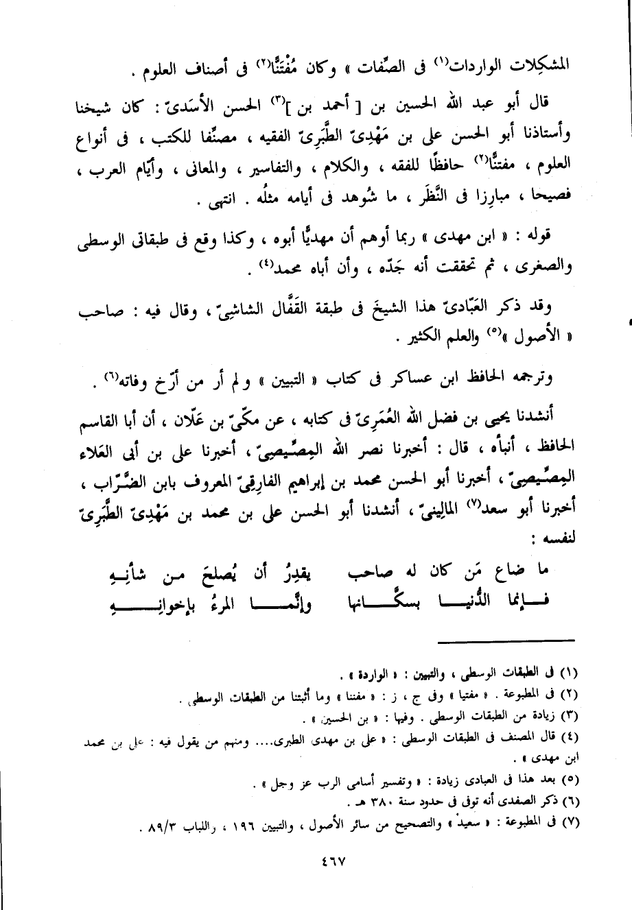قَالَ أَبُو عبد الله الْحُسَيْن بن أَحْمد بن الْحسن الأسدى كَانَ شَيخنَا وأستاذنا أَبُو الْحسن على بن مهدى الطبرى الْفَقِيه مصنفا للكتب فى أَنْوَاع الْعُلُوم مفتنا حَافِظًا للفقه وَالْكَلَام والتفاسير والمعانى وَأَيَّام الْعَرَب فصيحا مبارزا فى النّظر مَا شوهد فى أَيَّامه مثله انْتهى