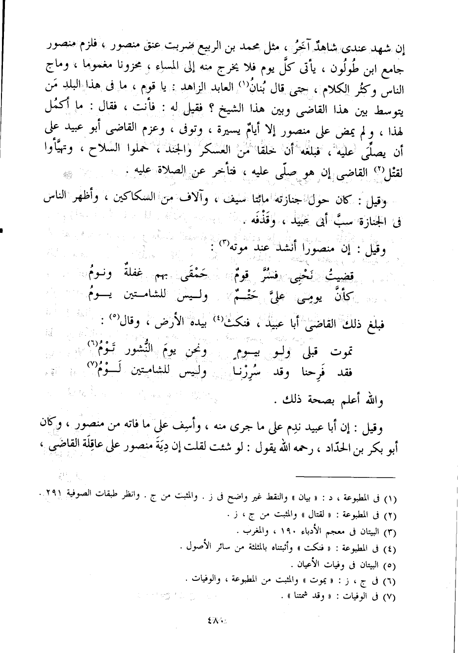 إِن شهد عندى شَاهد آخر مثل مُحَمَّد بن الرّبيع ضربت عنق مَنْصُور فَلَزِمَ مَنْصُور جَامع ابْن طولون يأتى كل يَوْم فَلَا يخرج مِنْهُ إِلَى الْمسَاء مَحْزُونا مغموما وماج النَّاس وَكثر الْكَلَام حَتَّى قَالَ بنان العابد الزَّاهِد يَا قوم مَا فى هَذَا الْبَلَد من يتوسط بَين هَذَا القاضى وَبَين هَذَا الشَّيْخ فَقيل لَهُ فَأَنت فَقَالَ مَا أكمل لهَذَا وَلم يمض على مَنْصُور إِلَّا أَيَّام يسيرَة وَتوفى وعزم القاضى أَبُو عبيد على أَن يصلى عَلَيْهِ فَبَلغهُ أَن خلقا من الْعَسْكَر والجند حملُوا السِّلَاح وتهيأوا لقتل القاضى إِن هُوَ صلى عَلَيْهِ فَتَأَخر عَن الصَّلَاة عَلَيْهِ