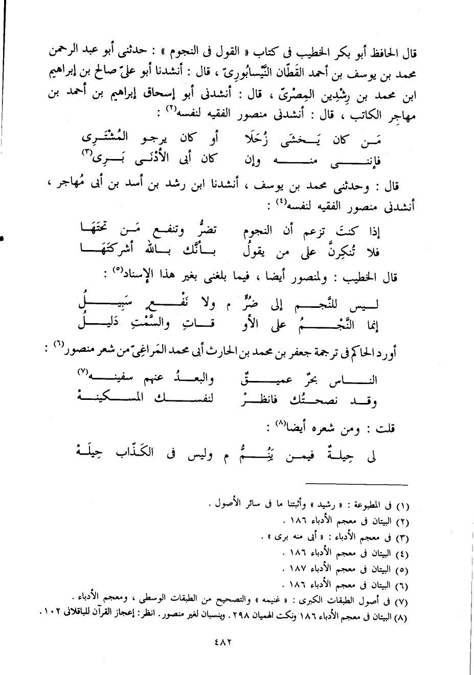 قَالَ الْحَافِظ أَبُو بكر الْخَطِيب فِي كتاب القَوْل فى النُّجُوم حَدَّثَنى أَبُو عبد الرَّحْمَن مُحَمَّد بن يُوسُف بن أَحْمد الْقطَّان النيسابورى قَالَ أنشدنا أَبُو على صَالح بن إِبْرَاهِيم ابْن مُحَمَّد بن رشدين المصرى قَالَ أنشدنى أَبُو إِسْحَاق إِبْرَاهِيم بن أَحْمد بن مهَاجر الْكَاتِب قَالَ أنشدنى مَنْصُور الْفَقِيه لنَفسِهِ