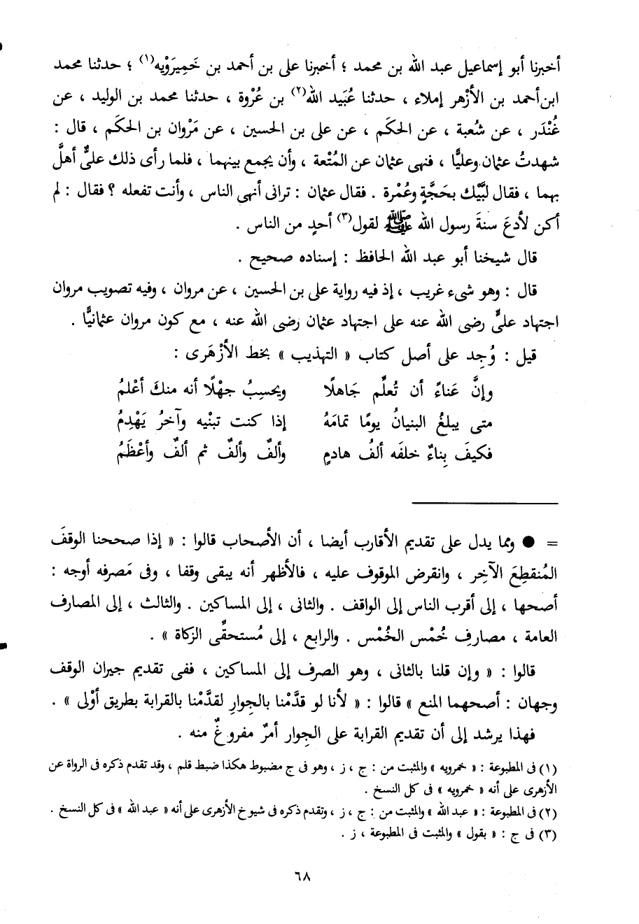 أخبرنَا أَبُو إِسْمَاعِيل عبد الله بن مُحَمَّد أخبرنَا على بن أَحْمد بن خميرويه حَدثنَا مُحَمَّد ابْن أَحْمد بن الْأَزْهَر إملاء حَدثنَا عبيد الله بن عُرْوَة حَدثنَا مُحَمَّد بن الْوَلِيد عَن غنْدر عَن شُعْبَة عَن الحكم عَن على بن الْحُسَيْن عَن مَرْوَان بن الحكم قَالَ شهِدت عُثْمَان وعليا فَنهى عُثْمَان عَن الْمُتْعَة وَأَن يجمع بَينهمَا فَلَمَّا رأى ذَلِك على أهل بهما فَقَالَ لبيْك بِحجَّة وَعمرَة فَقَالَ عُثْمَان ترانى أنهى النَّاس وَأَنت تَفْعَلهُ فَقَالَ لم أكن لأدع سنة رَسُول الله صلى الله عَلَيْهِ وَسلم لقَوْل أحد من النَّاس