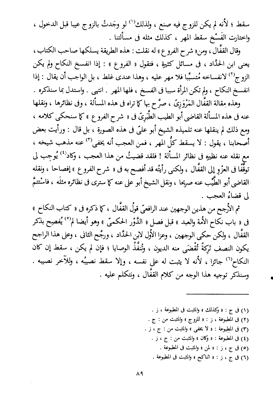 وَهَذِه مقَالَة الْقفال المروزى صرح بهَا كَمَا ترَاهُ فى هَذِه الْمَسْأَلَة وفى نظائرها ونقلها عَنهُ فى هَذِه الْمَسْأَلَة القاضى أَبُو الطّيب الطبرى فى شرح الْفُرُوع كَمَا سنحكى كَلَامه وَمَعَ ذَلِك لم ينقلها عَنهُ تِلْمِيذه الشَّيْخ أَبُو على فى هَذِه الصُّورَة بل قَالَ وَرَأَيْت بعض أَصْحَابنَا يَقُول لَا يسْقط كل الْمهْر فَمن الْعجب أَنه يخفى عَنهُ مَذْهَب شَيْخه مَعَ نَقله عَنهُ نَظِيره فى نَظَائِر الْمَسْأَلَة فَلَقَد قضيت من هَذَا الْعجب وَكَاد يُوجب لى توقفا فى الْعزو إِلَى الْقفال ولكنى رَأَيْته قد أفْصح بِهِ فى شرح الْفُرُوع إفصاحا وَنَقله القاضى أَبُو الطّيب عَنهُ صَرِيحًا وَنقل الشَّيْخ أَبُو على عَنهُ كَمَا سترى فى نَظَائِره مثله فَاسْتَتَمَّ لى قَضَاء الْعجب