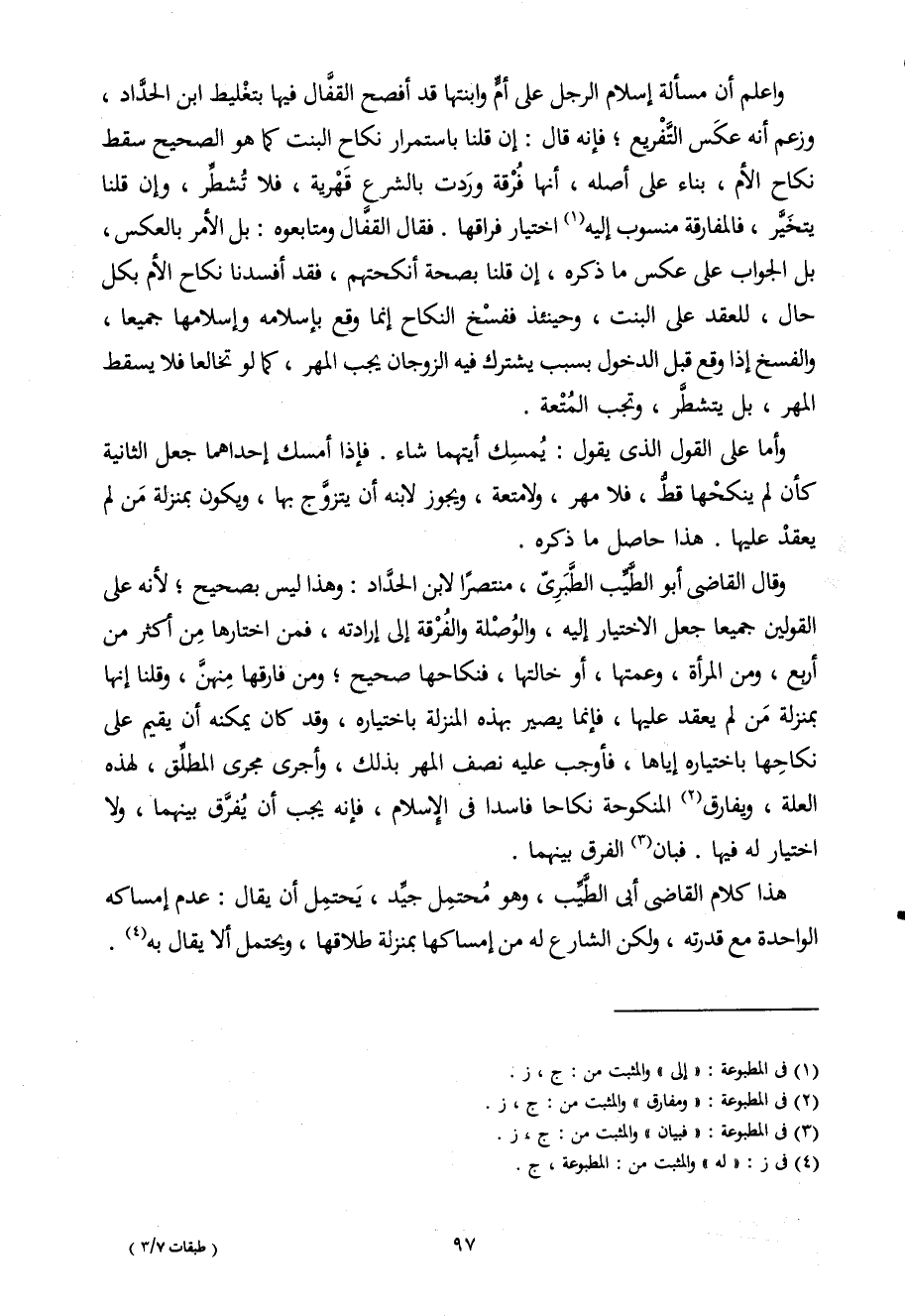 وَقَالَ القاضى أَبُو الطّيب الطبرى منتصرا لِابْنِ الْحداد وَهَذَا لَيْسَ بِصَحِيح لِأَنَّهُ على الْقَوْلَيْنِ جَمِيعًا جعل الِاخْتِيَار إِلَيْهِ والوصلة والفرقة إِلَى إِرَادَته فَمن اخْتَارَهَا من أَكثر من أَربع وَمن الْمَرْأَة وعمتها أَو خَالَتهَا فنكاحها صَحِيح وَمن فَارقهَا مِنْهُنَّ وَقُلْنَا إِنَّهَا بِمَنْزِلَة من لم يعْقد عَلَيْهَا فَإِنَّمَا يصير بِهَذِهِ الْمنزلَة بِاخْتِيَارِهِ وَقد كَانَ يُمكنهُ أَن يُقيم على نِكَاحهَا بِاخْتِيَارِهِ إِيَّاهَا فَأوجب عَلَيْهِ نصف الْمهْر بذلك وأجرى مجْرى الْمُطلق لهَذِهِ الْعلَّة وَيُفَارق الْمَنْكُوحَة نِكَاحا فَاسِدا فى الْإِسْلَام فَإِنَّهُ يجب أَن يفرق بَينهمَا وَلَا اخْتِيَار لَهُ فِيهَا فَبَان الْفرق بَينهمَا